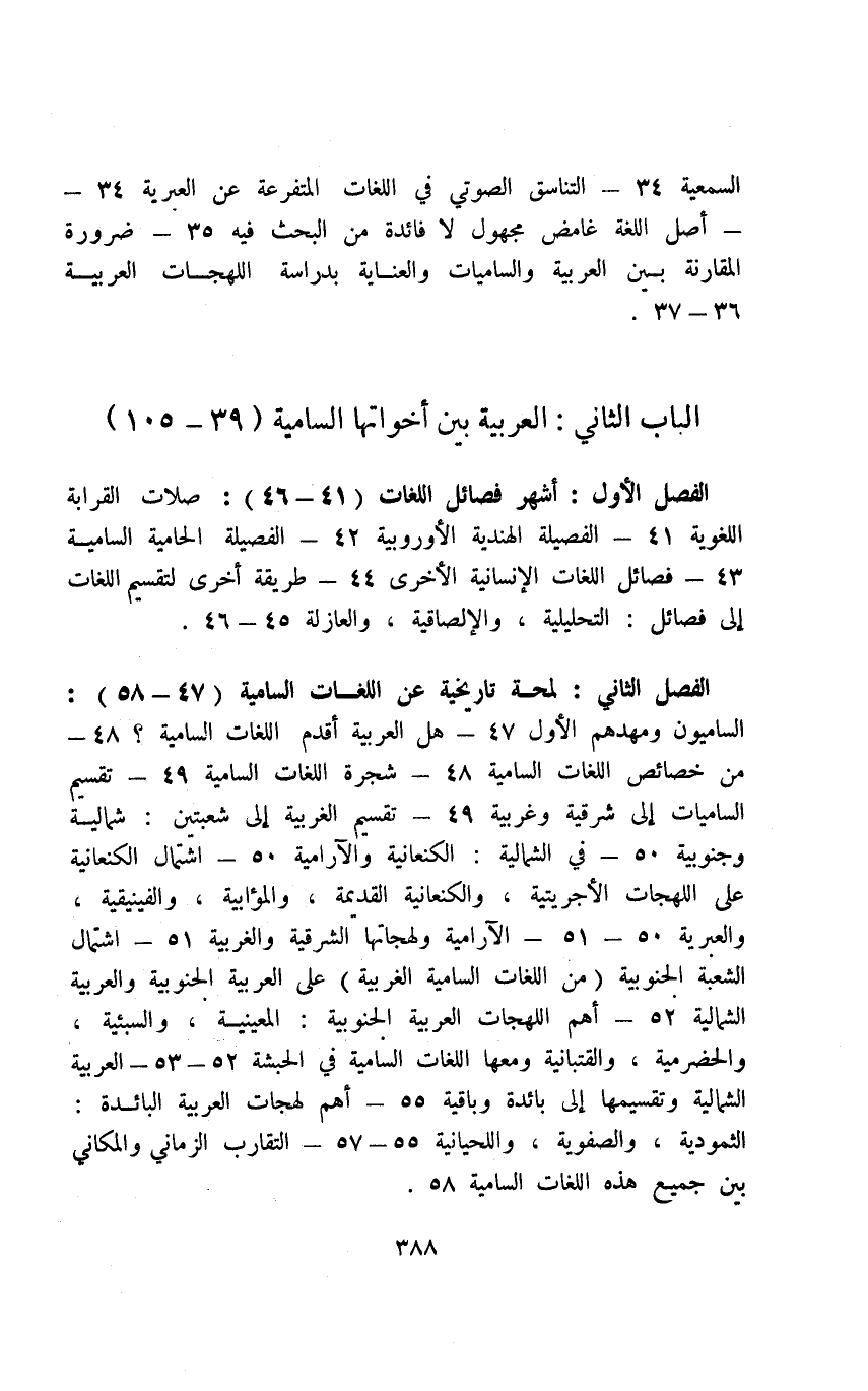 الفصل الثاني: لمحة تاريخية عن اللغات السامية "47 - 85": الساميون ومهدهم الأول 47 - هل العربية أقدم اللغات السامية؟ 48 - من خصائص اللغات السامية 48 - شجرة اللغات السامية 49 - تقسيم الساميات إلى شرقية وغربية 49 - تقسيم الغربية إلى شعبتين: شمالية وجنوبية 50 - في الشمالية: الكنعانية والآرامية 50 - اشتمال الكنعانية على اللهجات الأجريتية، والكنعانية القديمة، والمؤابية، والفينيقية، والعبرية 50 - 51 - الآرامية ولهجاتها الشرقية والغربية 51 - اشتمال الشعبة الجنوبية "من اللغات السامية الغربية" على العربية الجنوبية والعربية الشمالية 52 - أهم اللهجات العربية الجنوبية: المعينية، والسبئية، والحضرمية، والقتبانية ومعها اللغات السامية في الحبشة 52 - 53 - العربية الشمالية وتقسيمها إلى بائدة وباقية 55 - أهم اللهجات العربية البائدة: الثمودية، والصفوية، واللحيانية 55 - 57 - التقارب الزماني والمكاني بين جميع هذه اللغات السامية 58.