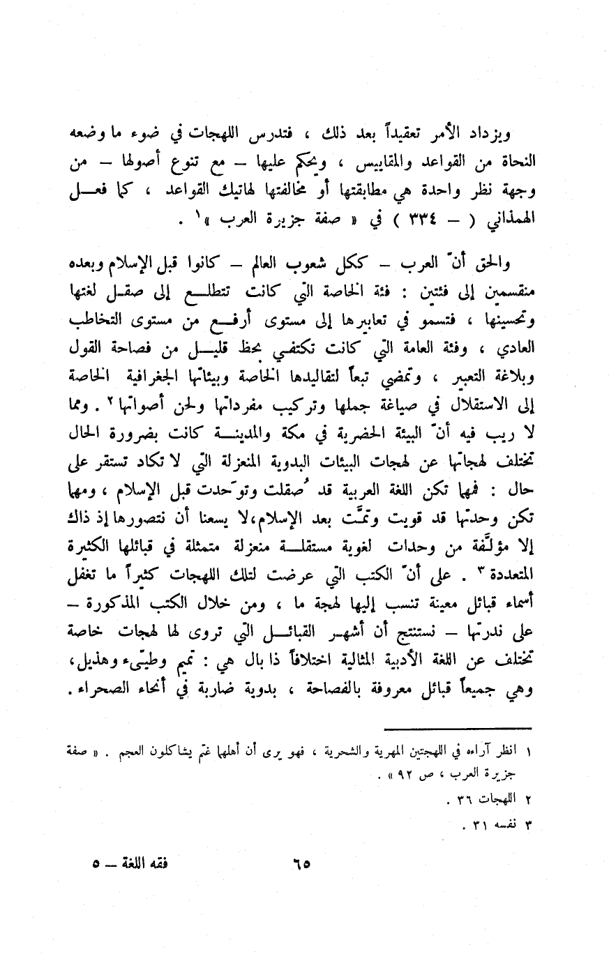 والحق أن العرب -ككل شعوب العالم- كانوا قبل الإسلام وبعده منقسمين إلى فئتين؛ فئة الخاصة التي كانت تتطلع إلى صقل لغتها وتحسينها، فتسمو في تعابيرها إلى مستوى أرفع من مستوى التخاطب العادي، وفئة العامة التي كانت تكتفي بحظ قليل من فصاحة القول وبلاغة اللتعبير، وتمضي تبعًا لتقاليدها الخاصة وبيئاتها الجغرافية الخاصة إلى الاستقلال في صياغة جملها وتركيب مفرداتها ولحن أصواتها2. ومما لا ريب فيه أن البيئة الحضرية في مكة والمدينة كانت بضرورة الحال تختلف لهجاتها عن لهجات البيئات البدوية المنعزلة التي لا تكاد تستقر على حال, فمهما تكن اللغة العربية قد صُقِلَت وتوحدت قبل الإسلام، ومهما تكن وحدتها قد قويت وتمت بعد الإسلام، لا يسعنا أن نتصورها إذ ذاك إلّا مؤلفة من وحدات لغوية مستقلة منعزلة, متمثلة في قبائلها الكثيرة المتعددة3. على أن الكتب التي عرضت لتلك اللهجات كثيرًا ما تغفل أسماء قبائل معينة تنسب إليها لهجةٌ ما، ومن خلال الكتب المذكورة -على ندرتها- نستنتج أن أشهر القبائل التي تورى لها لهجات خاصة تختلف عن اللغة الأدبية المثالية اختلافًا ذا بالٍ هي: تميم وطيئ وهذيل، وهي جميعًا قبائل معروفة بالفصاحة، بدوية ضاربة في أنحاء الصحراء.