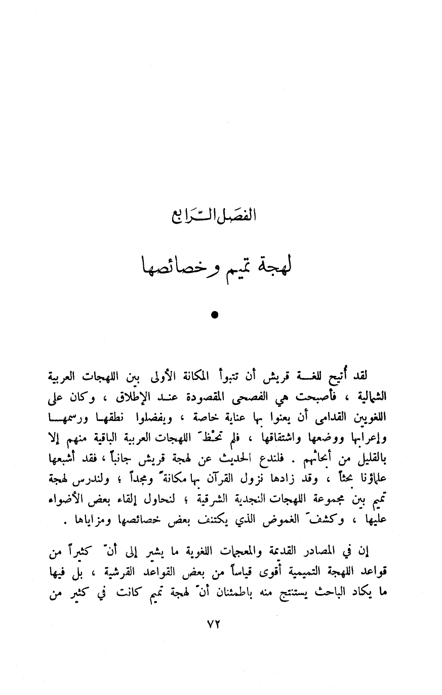 لقد أتيح للغة قريش أن تتبوأ المكانة الأولى بين اللهجات العربية الشمالية، فأصبحت هي الفصحى المقصودة عند الإطلاق، وكان على اللغويين القدامى أن يعنوا بها عناية خاصة، ويفضلوا نطقها ورسمها وإعرابها ووضعها واشتقاقها، فلم تحظ اللهجات العربية الباقية منهم إلّا بالقليل من أبحاثهم. فلندع الحديث عن لهجة قريش جانبًا، فقد أشبعها علماؤنا بحثًا، وقد زادها نزول القرآن بها مكانة ومجدًا؛ ولندرس لهجة تميم بين مجموعة اللهجات النجدية الشرقية؛ لنحاول إلقاء بعض الأضواء عليها، وكشف الغموض الذي يكتنف بعض خصائصها ومزاياها.
