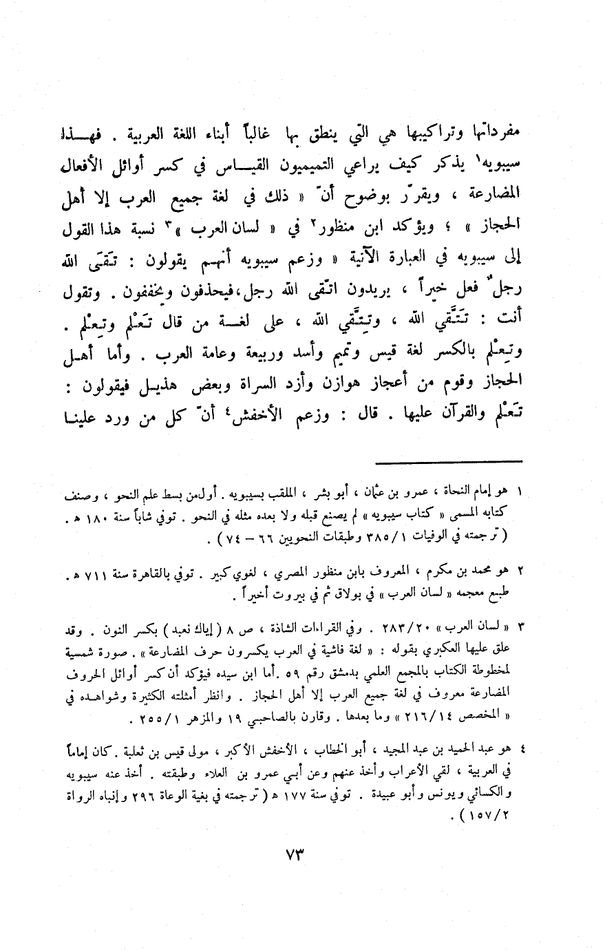 3 "لسان العرب" 20/ 283, وفي القراءات الشاذة، ص8 "إياك نِعبد" بكسر النون, وقد علق عليها العكبري بقوله: "لغة فاشية في العرب يكسرون حرف المضارعة" صورة شمسية لمخطوطة الكتاب بالمجمع العلمي بدمشق رقم 59, أما ابن سيده فيؤكد أن كسر أوائل الحروف المضارعة معروف في لغة جميع العرب إلّا أهل الحجاز. وانظر أمثلته الكثيرة وشواهده في "المخصص 14/ 216" وما بعدها, وقارن بالصاحبي 19/ والمزهر 1/ 255.