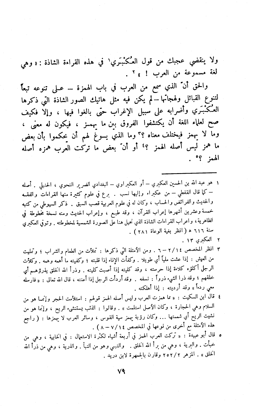 والحق أن الذي سمع من العرب في باب الهمزة -على تنوعه تبعًا لتنوع القبائل ولهجاتها- لم يكن فيه مثل هاتيك الصورة الشاذة التي ذكرها العكبري وأضرابه على سبيل الإغراب حتى بالغوا فيها، وإلّا فكيف صحَّ لعماء اللغة أن يكشتفوا الفروق بين ما يهمز، فيكون له معنى، وما لا يهمز فيختلف معناه؟ 3 وما الذي يسوغ لهم أن يحكموا بأن بعض ما همز ليس أصله الهمز؟ 4 أو أن بعض ما تركت العرب همزه أصله الهمز؟ 5.