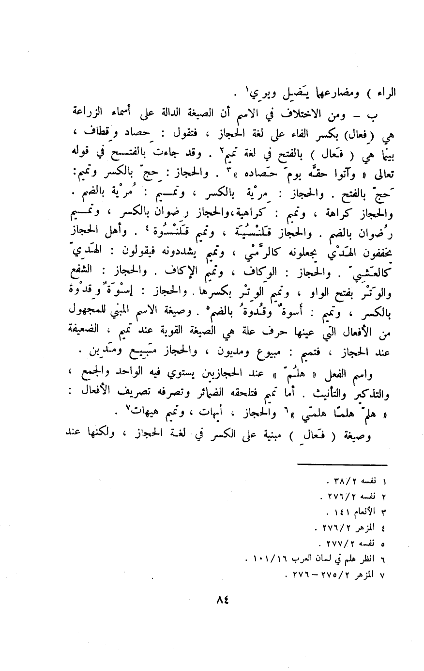 ب- ومن الاختلاف في الاسم أن الصيغة الدالة على أسماء الزراعة هي "فِعال" بكس الفاء على لغة الحجاز، فتقول: حِصاد وقِطاف، بينما هي "فَعال" بالفتح في لغة تميم2. وقد جاءت بالفتح في قوله تعالى: {وَآَتُوا حَقَّهُ يَوْمَ حَصَادِهِ} 3. والحجاز: حِجَّ بالكسر, وتميم: حَجَّ بالفتح. والحجاز: مِرية بالكسر، وتميم: مُرية بالضم.