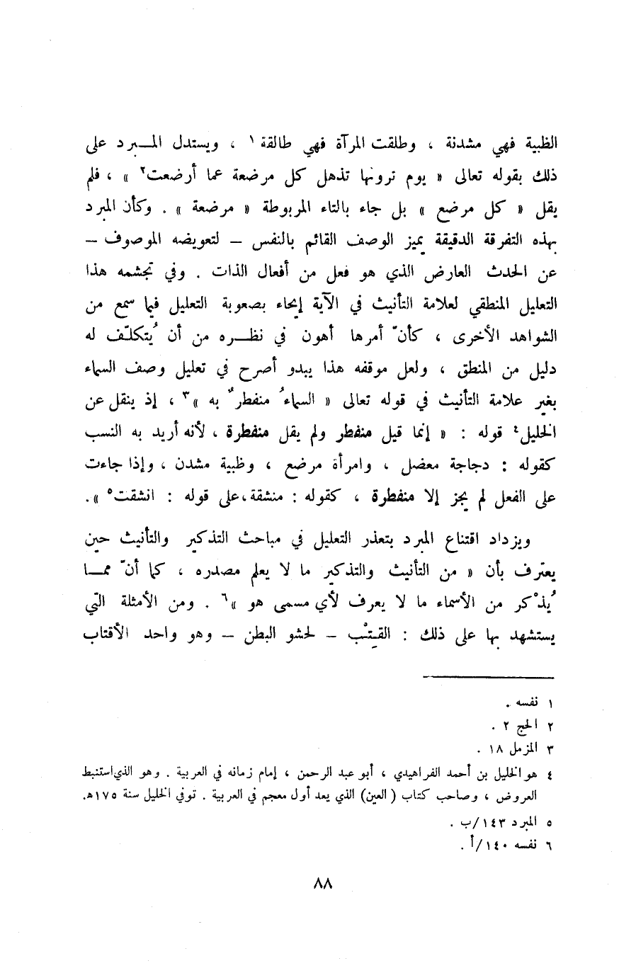 الظبية فهي مشدنة، وطلقت المرآة فهي طالقة1، ويستدل المبرد على ذلك بقوله تعالى: {يَوْمَ تَرَوْنَهَا تَذْهَلُ كُلُّ مُرْضِعَةٍ عَمَّا أَرْضَعَتْ} 2, فلم يقل: "كل مرضع" بل جاء بالتاء المربوطة "مرضعة", وكأن المبرد بهذه التفرقة الدقيقة تميز الوصف القائم بالنفس -لتعويضه الموصوف- عن الحدث العارض الذي هو فعل من أفعال الذات. وفي تجشمه هذا التعليل المنطقي لعلامة التأنيث في الآية, إيحاء بصعوبة التعليل فيما سمع من الشواهد الأخرى، كأن أمرها أهون في نظره من أن يتكلف له دليل من المنطق، ولعل موقفه هذا يبدو أصرح في تعليل وصف السماء بغير علامة التأنيث في قوله تعالى: {السَّمَاءُ مُنْفَطِرٌ بِه} 3؛ إذ ينقل عن الخليل4 قوله: "إنما قيل منفطر ولم يقل منفطرة؛ لأنه أريد به النسب؛ كقوله: دجاجة معضل، وامرأة مرضع، وظبية مشدن، وإذا جاءت على الفعل لم يجز إلّا منفطرة، كقوله: منشقة على قوله: "انشقت5".