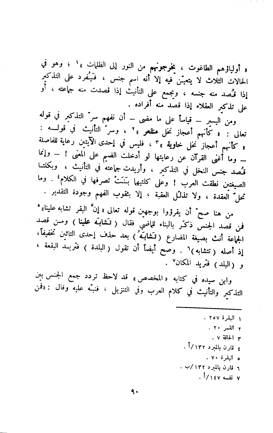 من هنا صحّ أن يقرءوا بوجهين قوله تعالى: {إِنَّ الْبَقَرَ تَشَابَهَ عَلَيْنَا} 5, فمن قصد الجنس, ذكر بالبناء للماضي فقال: "تشابه علينا", ومن قصد الجماعة أنّث بصيغة المضارع "تَشَابَهُ" بعد حذف إحدى التائين تخفيفًا إذ أصله "تتشابه"6, وصح أيضًا أن تقول: "البلدة" فتريد البقعة، و"البلد" فتريد المكان 7.