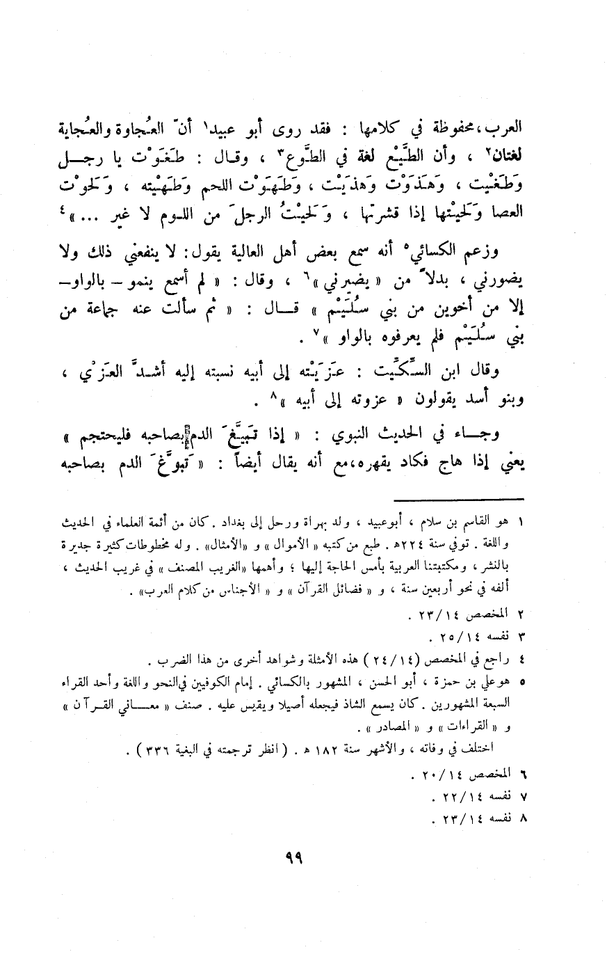 1 هو القاسم بن سلام، أبو عبيد، ولد بهراة ورحل إلى بغداد, كان من أئمة العلماء في الحديث واللغة, توفي سنة 224هـ, طبع من كتبه "الأموال" و"الأمثال", وله مخطوطات كثيرة جديرة بالنشر، ومكتبتنا العربية بأمس الحاجة إليها؛ وأهمها: "الغريب المصنف" في غريب الحديث، ألفه في نحو أربعين سنة، و"فضائل القرآن" و"الأجناس من كلام العرب".