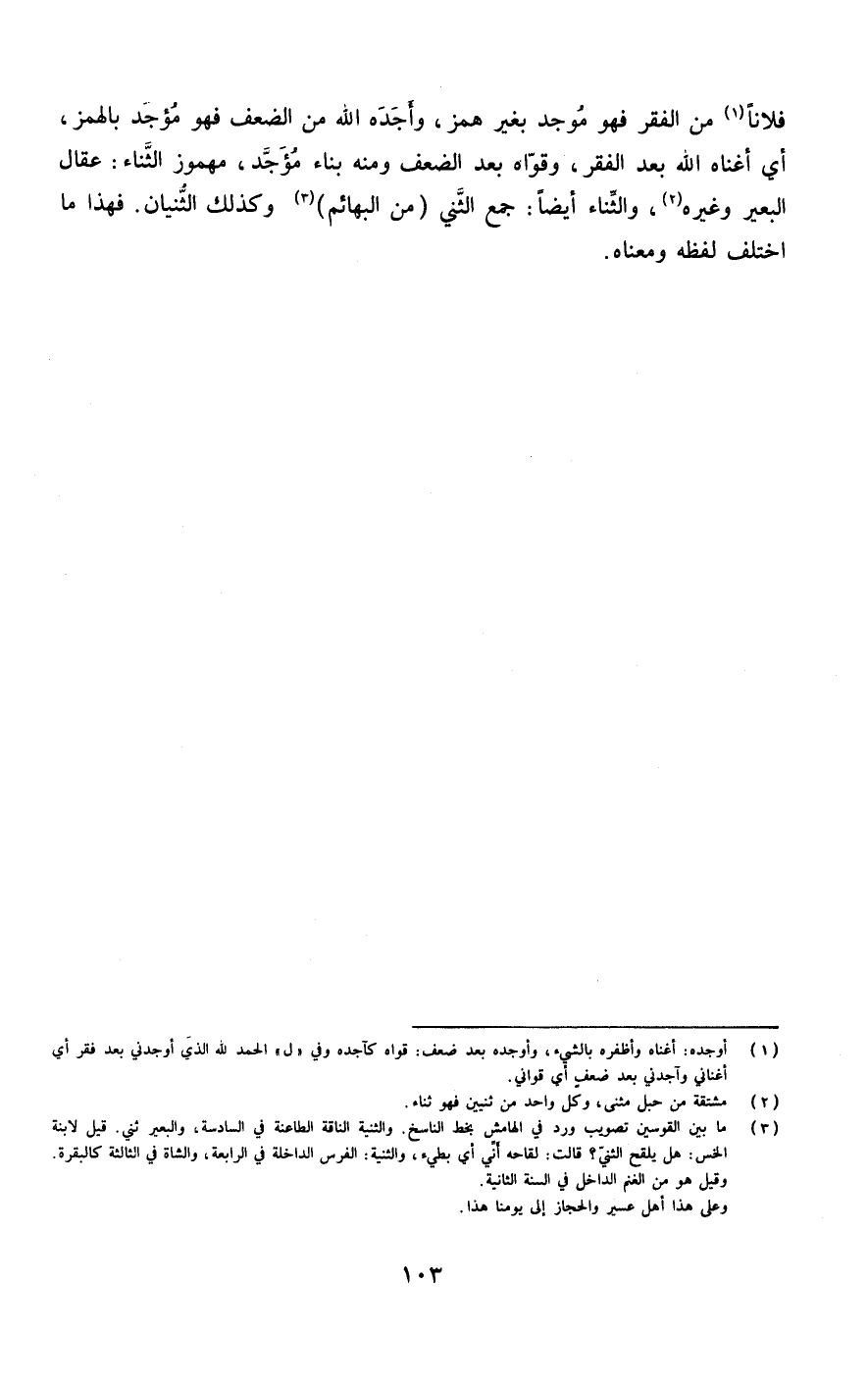 فلَانا من الْفقر فَهُوَ موجد بِغَيْر همز وأجده الله من الضعْف فَهُوَ مؤجد بِالْهَمْز أَي أغناه الله بعد الْفقر وَقواهُ بعد الضعْف وَمِنْه بِنَاء مؤجد مَهْمُوز الثَّنَاء عقال الْبَعِير وَغَيره وَالثنَاء أَيْضا جمع الثني من الْبَهَائِم وَكَذَلِكَ الثنيان فَهَذَا مَا اخْتلف لَفظه وَمَعْنَاهُ