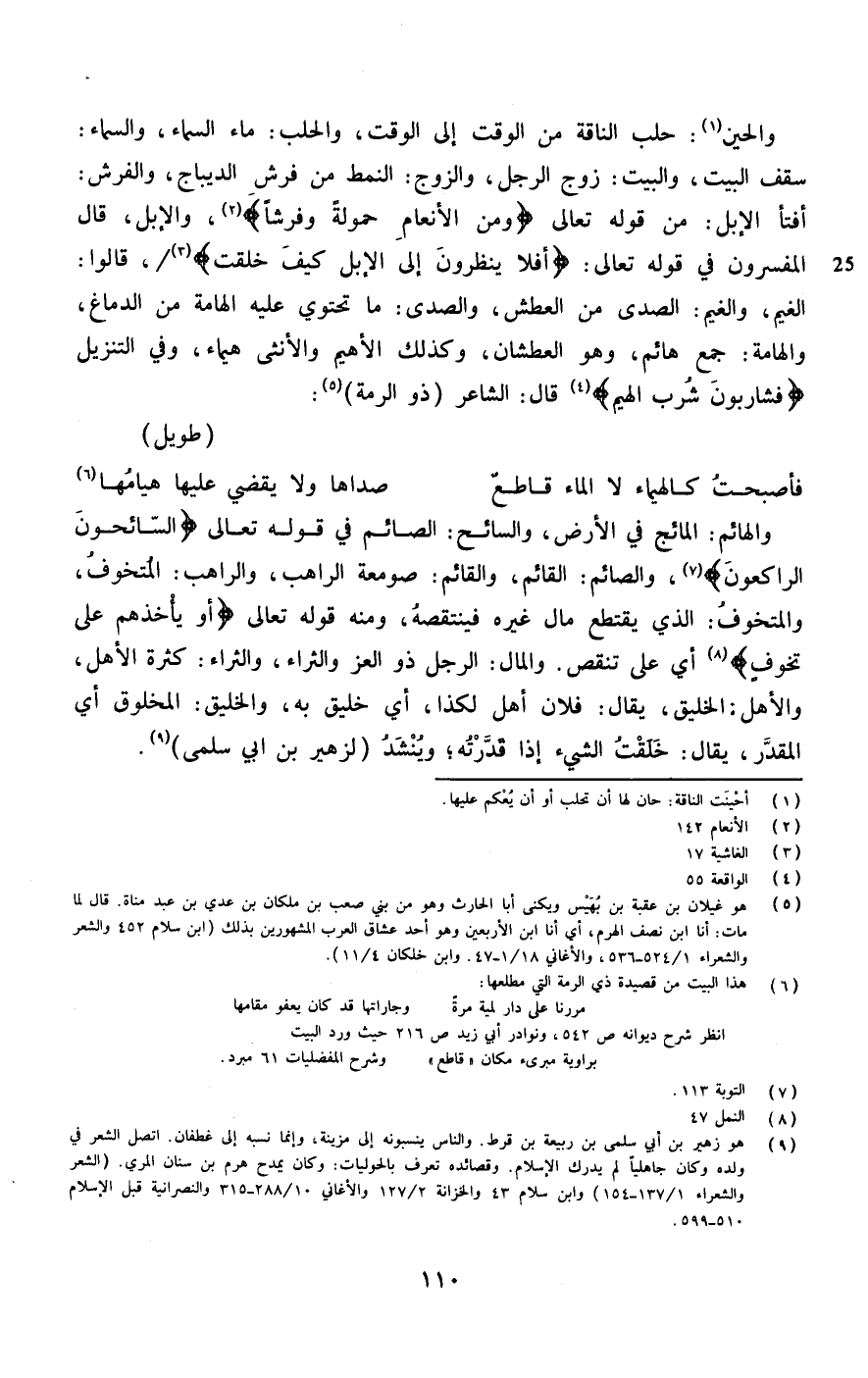 والحين حلب النَّاقة من الْوَقْت إِلَى الْوَقْت والحلب مَاء السَّمَاء وَالسَّمَاء سقف الْبَيْت وَالْبَيْت زوج الرجل وَالزَّوْج النمط من فرش الديباج والفرش أفتأ الْإِبِل من قَوْله تَعَالَى {وَمن الْأَنْعَام حمولة وفرشا} وَالْإِبِل قَالَ الْمُفَسِّرُونَ فِي قَوْله تَعَالَى {أَفلا ينظرُونَ إِلَى الْإِبِل كَيفَ خلقت} قَالُوا الْغَيْم والغيم الصدى من الْعَطش والصدى مَا تحتوي عَلَيْهِ الهامة من الدِّمَاغ والهامة جمع هائم وَهُوَ العطشان وَكَذَلِكَ الأهيم وَالْأُنْثَى هيماء وَفِي التَّنْزِيل {فشاربون شرب الهيم} قَالَ الشَّاعِر ذُو الرمة