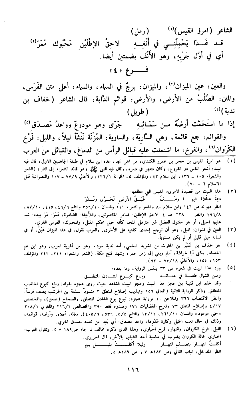 وَالْعين عين الْمِيزَان وَالْمِيزَان برج فِي السَّمَاء وَالسَّمَاء أَعلَى متن الْفرس والمتن الصلب من الأَرْض وَالْأَرْض قَوَائِم الدَّابَّة قَالَ الشَّاعِر خفاف بن ندبة)
