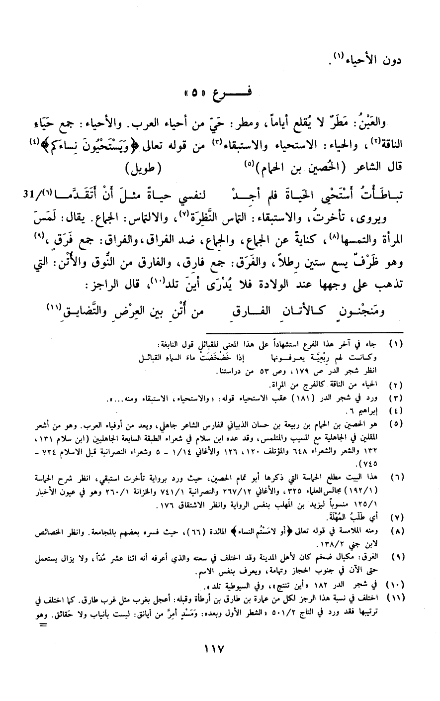 وَالْعين مطر لَا يقْلع أَيَّامًا ومطر حَيّ من أَحيَاء الْعَرَب والأحياء جمع حَيَاء النَّاقة وَالْحيَاء الاستحياء والاستبقاء من قَوْله تَعَالَى {ويستحيون نساءكم} قَالَ الشَّاعِر الْحصين بن الْحمام