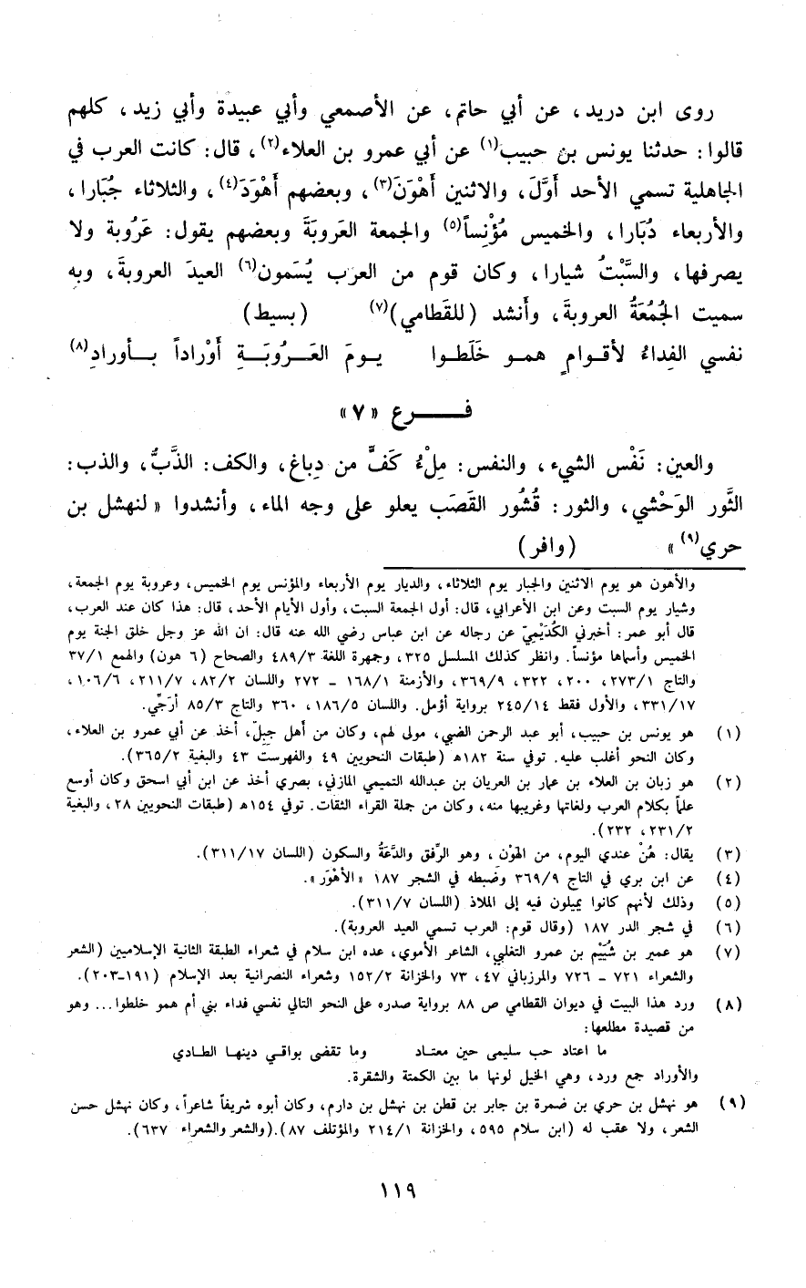 روى ابْن دُرَيْد عَن أبي حَاتِم عَن الْأَصْمَعِي وَأبي عُبَيْدَة وَأبي زيد كلهم قَالُوا حَدثنَا يُونُس بن حبيب عَن أبي عَمْرو بن الْعَلَاء قَالَ كَانَت الْعَرَب فِي الْجَاهِلِيَّة تسمي الْأَحَد أول والاثنين أَهْون وَبَعْضهمْ أهود وَالثُّلَاثَاء جبارا وَالْأَرْبِعَاء دبارا وَالْخَمِيس مؤنسا وَالْجُمُعَة الْعرُوبَة وَبَعْضهمْ يَقُول عرُوبَة وَلَا يصرفهَا والسبت شيارا وَكَانَ قوم من الْعَرَب يسمون الْعِيد الْعرُوبَة وَبِه سميت الْجُمُعَة الْعرُوبَة وَأنْشد للقطامي