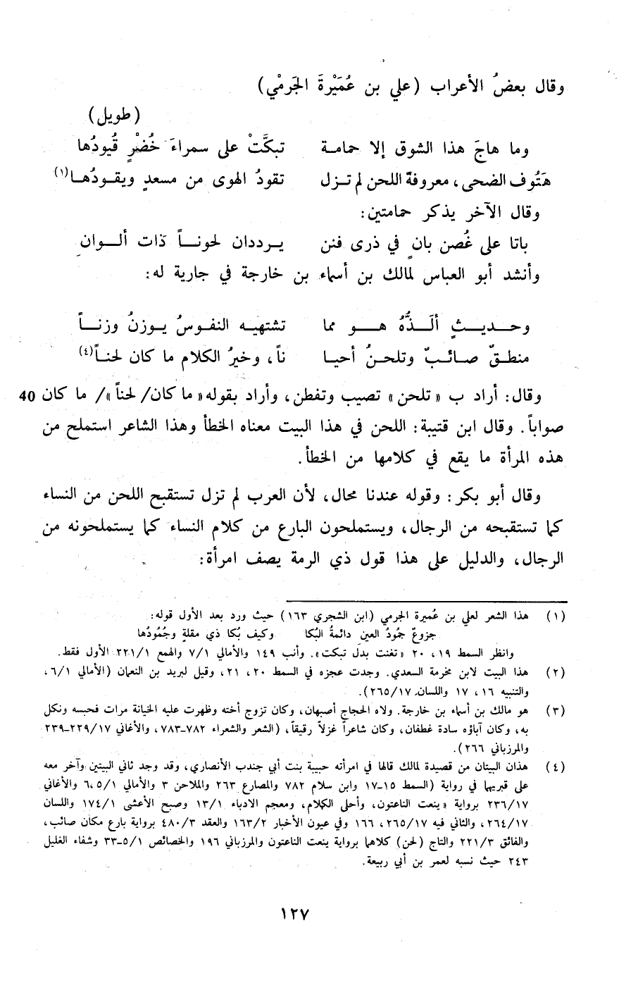 وَقَالَ أَبُو بكر وَقَوله عندنَا محَال لِأَن الْعَرَب لم تزل تستقبح اللّحن من النِّسَاء كَمَا تستقبحه من الرِّجَال ويستملحون البارع من كَلَام النِّسَاء كَمَا يستملحونه من الرِّجَال وَالدَّلِيل على هَذَا قَول ذِي الرمة يصف امْرَأَة