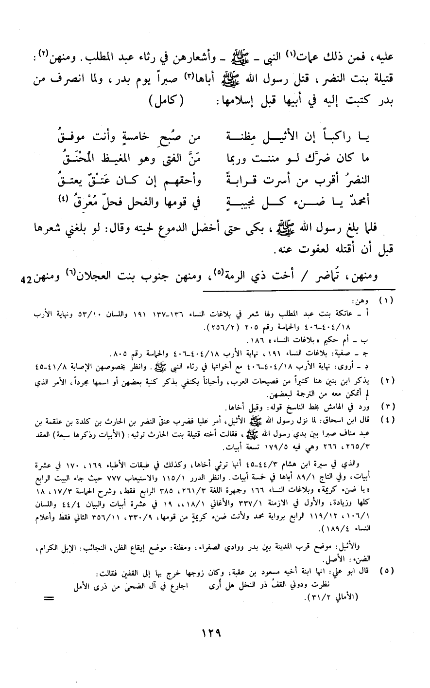 عَلَيْهِ فَمن ذَلِك عمات النَّبِي صلى الله عَلَيْهِ وَسلم وأشعارهن فِي رثاء عبد الْمطلب ومنهن قتيلة بنت النَّضر قتل رَسُول الله صلى الله عَلَيْهِ وَسلم أَبَاهَا صبرا يَوْم بدر وَلما انْصَرف من بدر كتبت إِلَيْهِ فِي أَبِيهَا قبل إسْلَامهَا