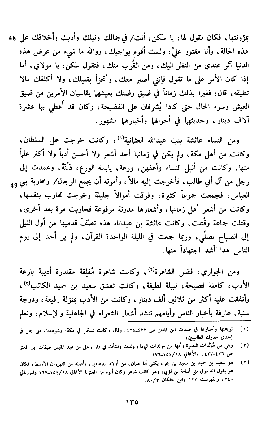 وَمن النِّسَاء عَائِشَة بنت عبد الله العثمانية وَكَانَت خرجت على السُّلْطَان وَكَانَت من أهل مَكَّة وَلم يكن فِي زمانها أحد أشعر وَلَا أحسن أدبا وَلَا أَكثر علما مِنْهَا وَكَانَت من أنبل النِّسَاء وأعفهن ورعة يابسة الْوَرع دينة وعمدت إِلَى رجل من آل أبي طَالب فأخرجت إِلَيْهِ مَالا وأمرته وأمرته أَن يجمع الرِّجَال ومحاربة بني الْعَبَّاس فَجمعت جموعا كَثِيرَة وَفرقت أَمْوَالًا جليلة وَخرجت تحارب بِنَفسِهَا وَكَانَت من أشعر أهل زمانها وَأَشْعَارهَا مدونة مَرْفُوعَة فحاربت مرّة بعد أُخْرَى وَقتلت جمَاعَة وَقتلت وَكَانَت عَائِشَة بن عبد الله هَذِه تصف قدميها من أول اللَّيْل إِلَى الصَّباح تصلي وَرُبمَا جمعت فِي اللَّيْلَة الْوَاحِدَة الْقُرْآن وَلم ير أحد إِلَى يَوْم النَّاس هَذَا أَشد اجْتِهَادًا مِنْهَا