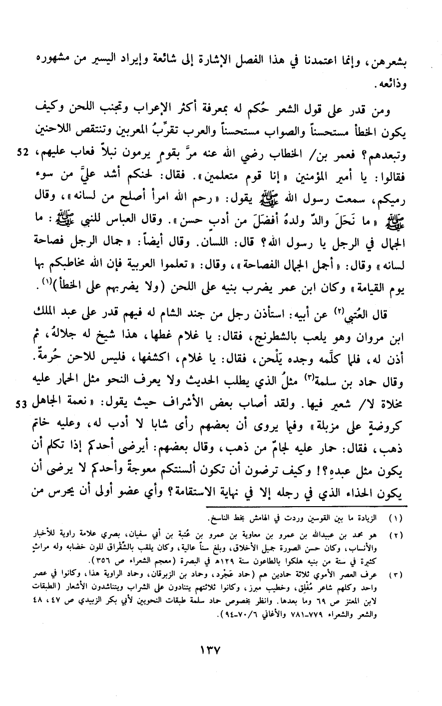 وَمن قدر على قَول الشّعْر حكم لَهُ بِمَعْرِِفَة أَكثر الْإِعْرَاب وتجنب اللّحن وَكَيف يكون الْخَطَأ مستحسنا وَالصَّوَاب مستحسنا وَالْعرب تقرب المعربين وتنتقص اللاجنين وتبعدهم فعمر بن الْخطاب رَضِي الله عَنهُ مر بِقوم يرْمونَ نبْلًا فعاب عَلَيْهِم فَقَالُوا يَا أَمِير الْمُؤمنِينَ إِنَّا قوم متعلمين فَقَالَ لحنكم أَشد عَليّ من سوء رميكم سَمِعت رَسُول الله صلى الله عَلَيْهِ وَسلم يَقُول رحم الله امْرأ أصلح من لِسَانه وَقَالَ صلى الله عَلَيْهِ وَسلم مَا نحل وَالِد وَلَده أفضل من أدب حسن وَقَالَ الْعَبَّاس للنَّبِي صلى الله عَلَيْهِ وَسلم مَا الْجمال فِي الرجل يَا رَسُول الله قَالَ اللِّسَان وَقَالَ أَيْضا جمال الرجل فصاحة لِسَانه وَقَالَ أجمل الْجمال الفصاحة وَقَالَ تعلمُوا الْعَرَبيَّة فَإِن الله مخاطبكم بهَا يَوْم الْقِيَامَة وَكَانَ ابْن عمر يضْرب بنيه على اللّحن وَلَا يَضْرِبهُمْ على الْخَطَأ قَالَ العتبى عَن أَبِيه اسْتَأْذن رجل من جند الشَّام لَهُ فيهم قدر على عبد الْملك ابْن مَرْوَان وَهُوَ يلْعَب بالشطرنج فَقَالَ يَا غُلَام غطها هَذَا شيخ لَهُ جَلَاله ثمَّ أذن لَهُ فَلَمَّا كَلمه وجده يلحن فَقَالَ يَا غُلَام اكشفها فَلَيْسَ للاحن حُرْمَة وَقَالَ حَمَّاد بن سَلمَة مثل الَّذِي يطْلب الحَدِيث وَلَا يعرف النَّحْو مثل الْحمار عَلَيْهِ مخلاة لَا شعير فِيهَا وَلَقَد أصَاب بعض الْأَشْرَاف حَيْثُ يَقُول نعْمَة الْجَاهِل كروضة على مزبلة وَفِيمَا يرْوى أَن بَعضهم رأى شَابًّا لَا أدب لَهُ وَعَلِيهِ خَاتم ذهب فَقَالَ حمَار عَلَيْهِ لجام من ذهب وَقَالَ بَعضهم أيرضى أحدكُم إِذا تكلم أَن يكون مثل عَبده وَكَيف ترْضونَ أَن تكون أَلْسِنَتكُم معوجة وأحدكم لَا يرضى أَن يكون الْحذاء الَّذِي فِي رجله إِلَّا فِي نِهَايَة الاسْتقَامَة وَأي عُضْو أولى أَن يحرس من