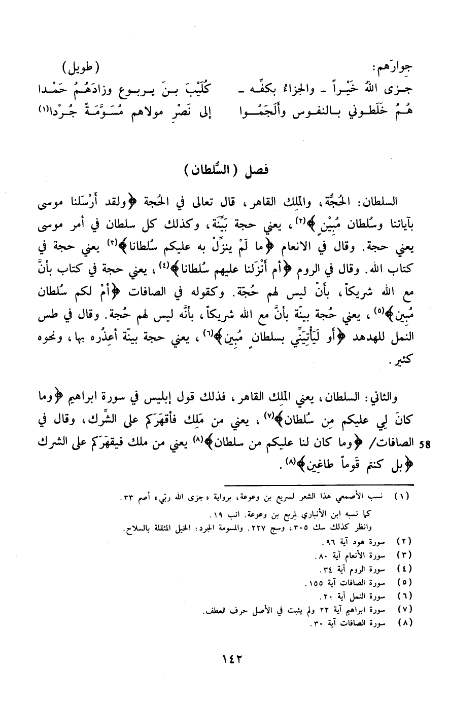 السُّلْطَان الْحجَّة وَالْملك القاهر قَالَ تَعَالَى فِي الْحجَّة {وَلَقَد أرسلنَا مُوسَى بأياتنا وسلطان مُبين} يَعْنِي حجَّة بَيِّنَة وَكَذَلِكَ كل سُلْطَان فِي أَمر مُوسَى يَعْنِي حجَّة وَقَالَ فِي الْأَنْعَام {مَا لم ينزل بِهِ سُلْطَانا} يَعْنِي حجَّة فِي كتاب الله وَقَالَ فِي الرّوم {أم أنزلنَا عَلَيْهِم سُلْطَانا} يَعْنِي حجَّة فِي كتاب بِأَن مَعَ الله شَرِيكا بِأَن لَيْسَ لَهُم حجَّة وَكَقَوْلِه فِي الصافات {أم لكم سُلْطَان مُبين} يَعْنِي حجَّة بَيِّنَة بِأَن مَعَ الله شَرِيكا بِأَنَّهُ لَيْسَ لَهُم حجَّة وَقَالَ فِي طس النَّمْل للهدهد (أَو ليأتيني بسُلْطَان مُبين) يَعْنِي حجَّة بَيِّنَة أعذره بهَا وَنَحْوه كثير