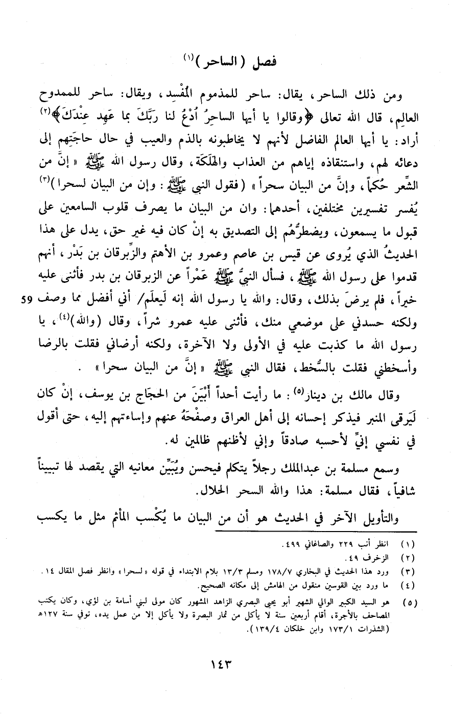 وَمن ذَلِك السَّاحر يُقَال للمذموم الْمُفْسد وَيُقَال سَاحر للممدوح الْعَالم قَالَ الله تَعَالَى {وَقَالُوا يَا أَيهَا السَّاحر ادْع لنا رَبك بِمَا عهد عنْدك} أَرَادَ يَا أَيهَا الْعَالم الْفَاضِل لأَنهم لَا يخاطبونه بالذم وَالْعَيْب فِي حَال حَاجتهم إِلَى دُعَائِهِ لَهُم واستنقاذه إيَّاهُم من الْعَذَاب والهلكة وَقَالَ رَسُول الله صلى الله عَلَيْهِ وَسلم (إِن من الشّعْر حكما وَإِن من الْبَيَان سحرًا) فَقَوْل النَّبِي صلى الله عَلَيْهِ وَسلم وَإِن من الْبَيَان لسحرا يُفَسر تفسيرين مُخْتَلفين أَحدهمَا وان من الْبَيَان مَا يصرف قُلُوب السامعين على قبُول مَا يسمعُونَ ويضطرهم إِلَى التَّصْدِيق بِهِ إِن كَانَ فِيهِ غير حق يدل على هَذَا الحَدِيث الَّذِي يرْوى عَن قيس بن عَاصِم وَعَمْرو بن الْأَهْتَم والزبرقان بن بدر أَنهم قدمُوا على رَسُول الله صلى الله عَلَيْهِ وَسلم فَسَأَلَ النَّبِي صلى الله عَلَيْهِ وَسلم عمرا عَن الزبْرِقَان بن بدر فَأثْنى عَلَيْهِ خيرا فَلم يرض بذلك وَقَالَ وَالله يَا رَسُول الله إِنَّه ليعلم أَنِّي أفضل مِمَّا وصف وَلكنه حسدني على موضعي مِنْك فَأثْنى عَلَيْهِ عَمْرو شرا وَقَالَ وَالله يَا رَسُول الله مَا كذبت عَلَيْهِ فِي الأولى وَلَا الْآخِرَة وَلكنه أرضاني فَقلت بِالرِّضَا وأسخطني فَقلت بالسخط فَقَالَ النَّبِي صلى الله عَلَيْهِ وَسلم (إِن من الْبَيَان لسحرا)