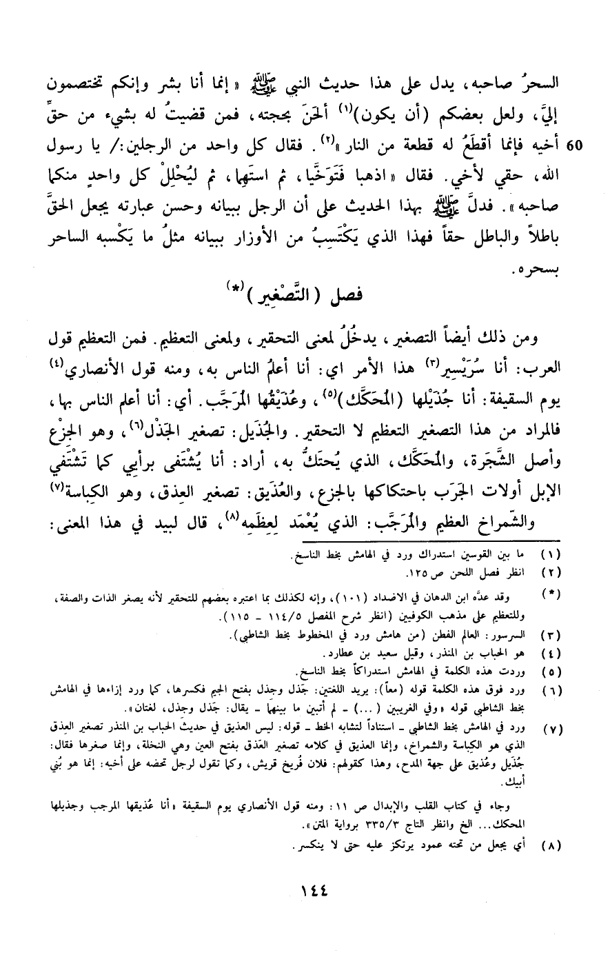 السحر صَاحبه يدل على هَذَا حَدِيث النَّبِي صلى الله عَلَيْهِ وَسلم (إِنَّمَا أَنا بشر وَإِنَّكُمْ تختصمون إِلَيّ وَلَعَلَّ بَعْضكُم أَن يكون أَلحن بحجته فَمن قضيت لَهُ بِشَيْء من حق أَخِيه فَإِنَّمَا أقطع لَهُ قِطْعَة من النَّار فَقَالَ كل وَاحِد من الرجلَيْن يَا رَسُول الله حَقي لأخي فَقَالَ اذْهَبَا فَتَوَخَّيَا ثمَّ اسْتهمَا ثمَّ ليحلل كل وَاحِد مِنْكُمَا صَاحبه فَدلَّ صلى الله عَلَيْهِ وَسلم بِهَذَا الحَدِيث على أَن الرجل ببيانه وَحسن عِبَارَته يَجْعَل الْحق بَاطِلا وَالْبَاطِل حَقًا فَهَذَا الَّذِي يكْتَسب من الأوزار ببيانه مثل مَا يكسبه السَّاحر بسحره