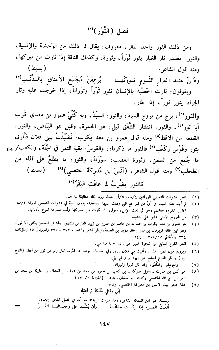 وَمن ذَلِك الثور وَاحِد الْبَقر مَعْرُوف يُقَال لَهُ ذَلِك من الوحشية والإنسية والثور مصدر ثار الْغُبَار يثور ثورا وثورة وَكَذَلِكَ النَّاقة إِذا ثارت من مبركها وَمِنْه قَول الشَّاعِر