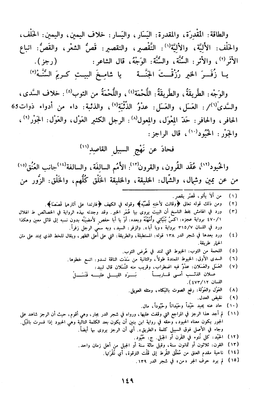 (يَا زفر الْخَيْر رزقت الْجنَّة ... يَا شامخ الْبَيْت كريم السنه) // رجز // وَالْوَجْه الطَّرِيقَة والطريقة اللحمة واللحمة من الثَّوْب خلاف السدى والسدى الْعَسَل وَالْعَسَل عَدو الذئبة والذئبة دَاء من أدواء ذَوَات الْحَافِر والحافر حد الْمعول والمعول الرجل الْكثير الْعَوْل والعول الْجور والجور الحيود قَالَ الراجز