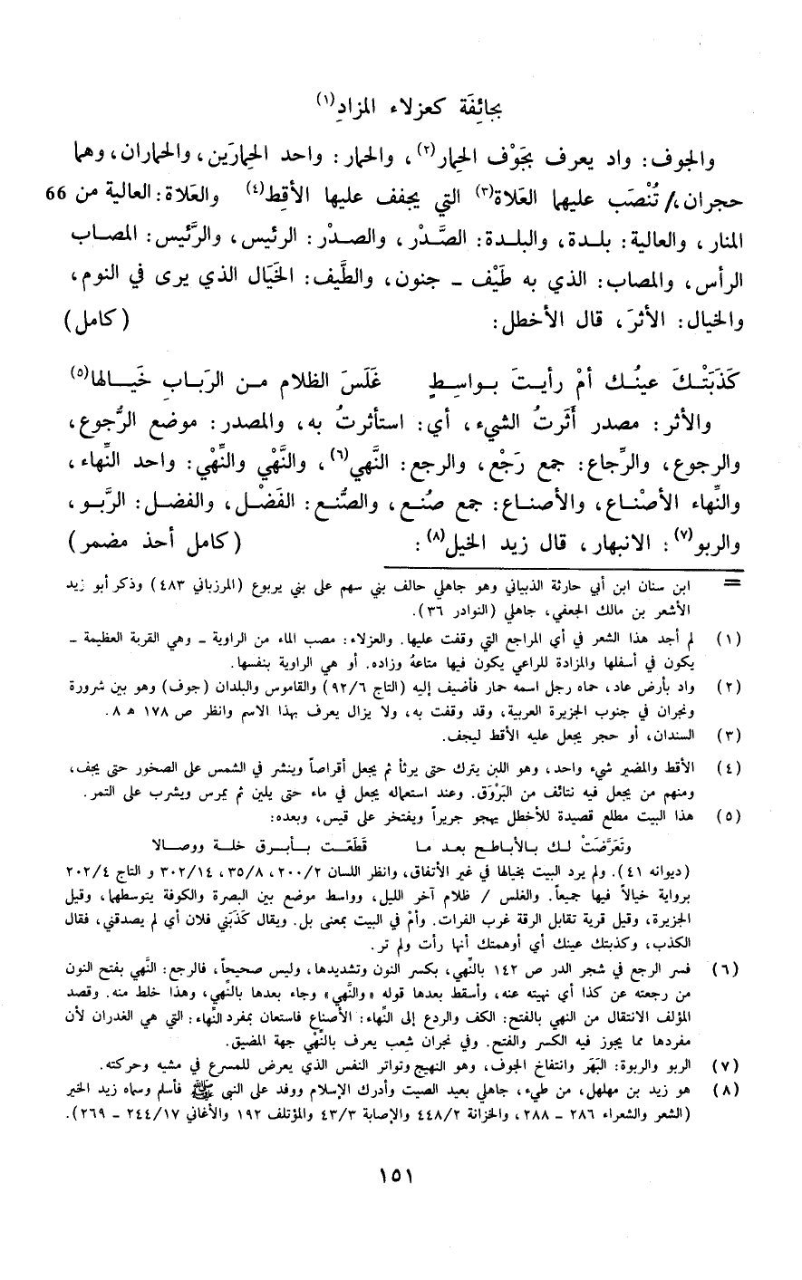 والجوف وَاد يعرف بجوف الْحمار وَالْحمار وَاحِد الحمارين والحماران وهما حجران تنصب عَلَيْهِمَا العلاة الَّتِي يجفف عَلَيْهَا الأقط والعلاة الْعَالِيَة من الْمنَار والعالية بَلْدَة والبلدة الصَّدْر والصدر الرئيس والرئيس الْمُصَاب الرَّأْس والمصاب الَّذِي بِهِ طيف جُنُون والطيف الخيال الَّذِي يرى فِي النّوم والخيال الْأَثر قَالَ الأخطل