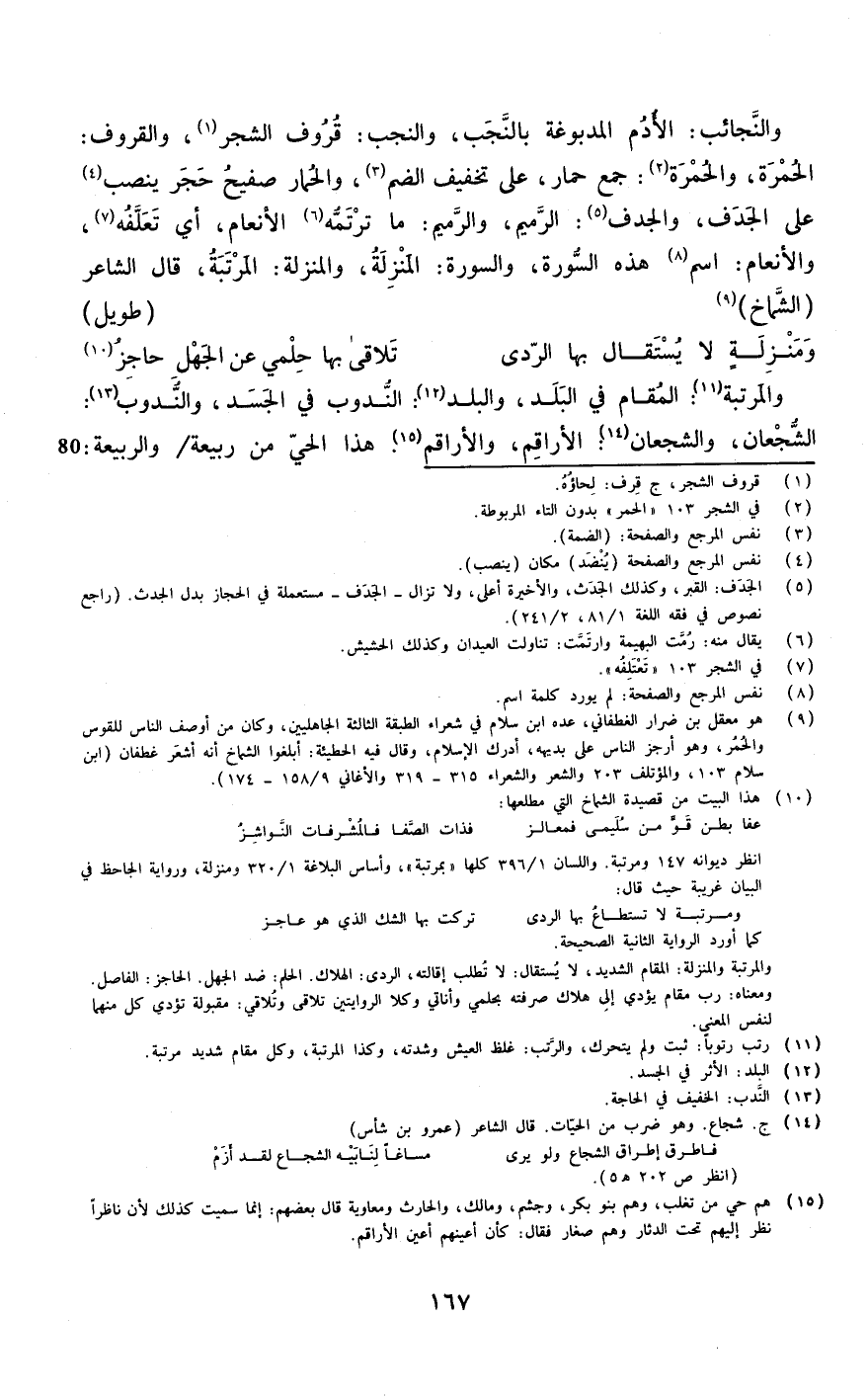 والمرتبة الْمقَام فِي الْبَلَد والبلد الندوب فِي الْجَسَد والندوب الشجعان والشجعان الأراقم والأراقم هَذَا الْحَيّ من ربيعَة والربيعة