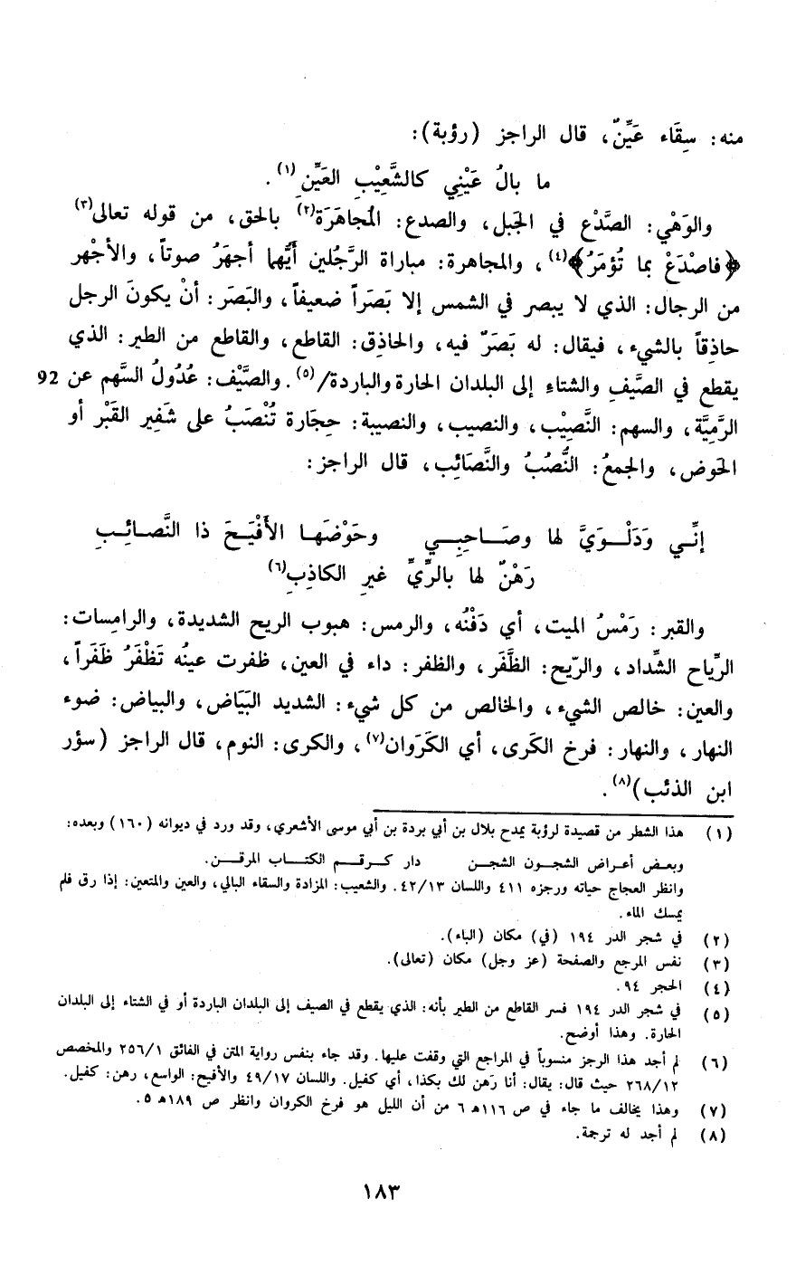 والوهي الصدع فِي الْجَبَل والصدع المجاهرة بِالْحَقِّ من قَوْله تَعَالَى {فَاصْدَعْ بِمَا تُؤمر} والجاهرة مباراة الرجلَيْن أَيهمَا أَجْهَر صَوتا والأجهر من الرِّجَال الَّذِي لَا يبصر فِي الشَّمْس إِلَّا بصرا ضَعِيفا وَالْبَصَر أَن يكون الرجل حاذقا بالشَّيْء فَيُقَال لَهُ بصر فِيهِ والحاذق الْقَاطِع والقاطع من الطير الَّذِي يقطع فِي الصَّيف والشتاء الى الْبلدَانِ الحارة والباردة والصيف عدُول السهْم عَن الرَّمية والسهم النَّصِيب والنصيب والنصيبة حِجَارَة تنصب عل شَفير الْقَبْر أَو الْحَوْض وَالْجمع النصب والنصائب قَالَ الراجز