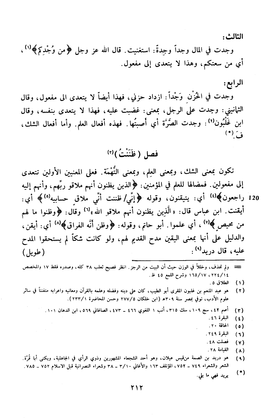 تكون بِمَعْنى الشَّك وَبِمَعْنى الْعلم وَبِمَعْنى التُّهْمَة فعلى الْمَعْنيين الْأَوَّلين تتعدى إِلَى مفعولين فمضالها للْعلم فِي الْمُؤمنِينَ {الَّذين يظنون أَنهم ملاقو رَبهم وَأَنَّهُمْ إِلَيْهِ رَاجِعُون} أَي يتيقنون وَقَوله {إِنِّي ظَنَنْت أَنِّي ملاق حسابيه} أَي أيقنت ابْن عَبَّاس قَالَ {الَّذين يظنون أَنهم ملاقوا الله} وَقَالَ {وظنوا مَا لَهُم من محيص} أَي علمُوا أَبُو حَاتِم وَقَوله {وَظن أَنه الْفِرَاق} أَي أَيقَن وَالدَّلِيل على أَنَّهَا بِمَعْنى الْيَقِين مدح الْقَدِيم لَهُم وَلَو كَانَت شكا لم يستحقوا الْمَدْح عَلَيْهِ قَالَ دُرَيْد