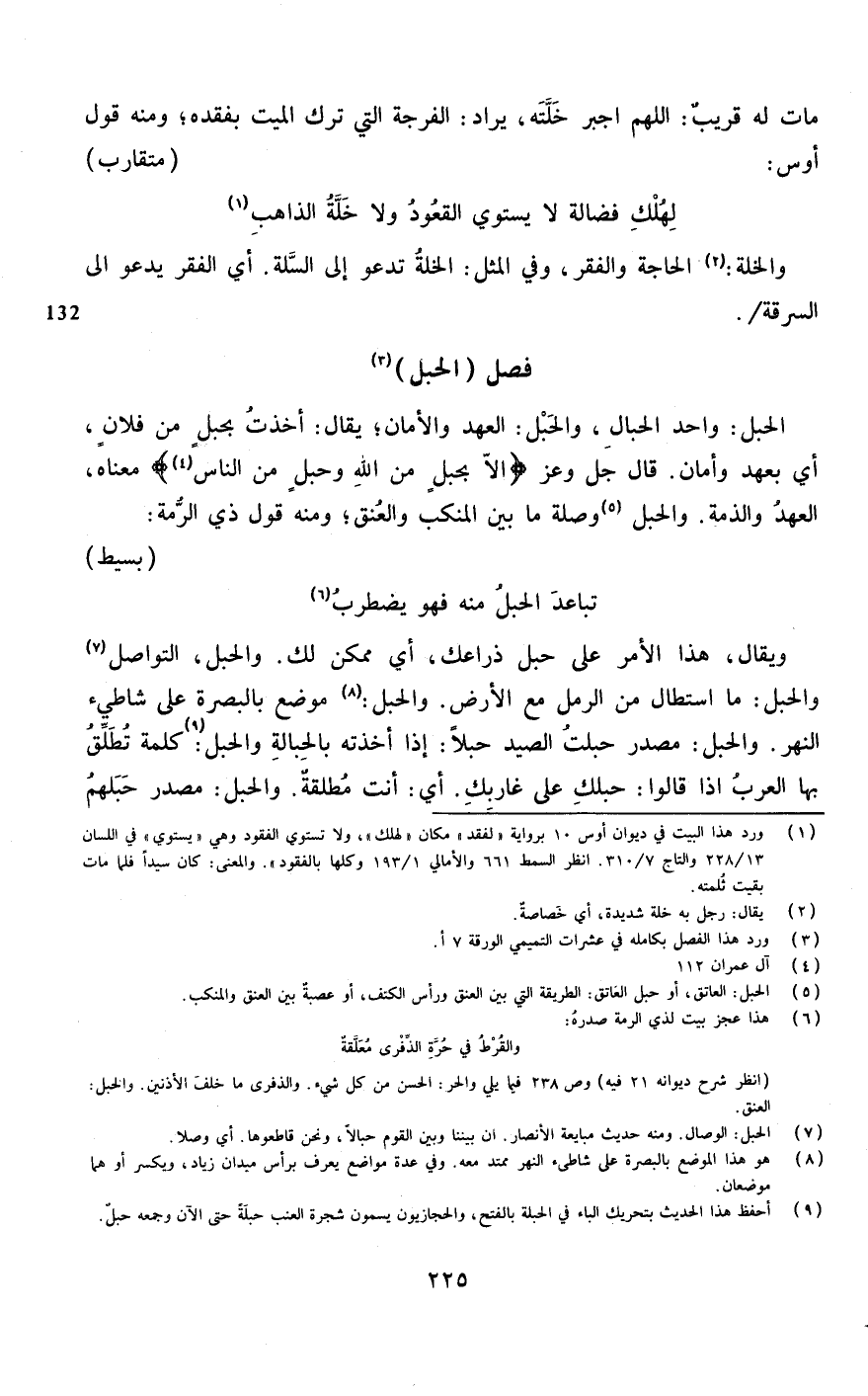 الْحَبل وَاحِد الحبال وَالْحَبل الْعَهْد والأمان يُقَال أخذت بِحَبل من فلَان أَي بِعَهْد وأمان قَالَ جلّ وَعز {إِلَّا بِحَبل من الله وحبل من النَّاس} مَعْنَاهُ الْعَهْد والذمة وَالْحَبل وصلَة مَا بَين الْمنْكب والعنق وَمِنْه قَول ذِي الرمة