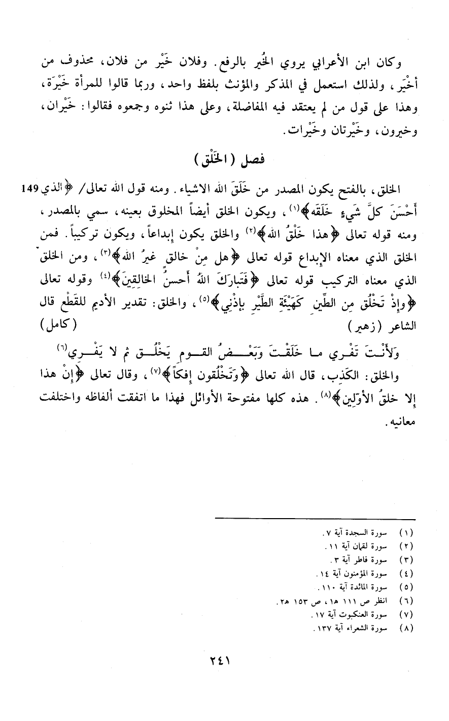 الْخلق بِالْفَتْح يكون الْمصدر من خلق الله الاشياء وَمِنْه قَول الله تَعَالَى {الَّذِي أحسن كل شَيْء خلقه} وَيكون الْخلق أَيْضا الْمَخْلُوق بِعَيْنِه سمي بِالْمَصْدَرِ وَمِنْه قَوْله تَعَالَى {هَذَا خلق الله} والخلق يكون إبداعا وَيكون تركيبا فَمن الْخلق الَّذِي مَعْنَاهُ الإبداع قَوْله تَعَالَى {هَل من خَالق غير الله}