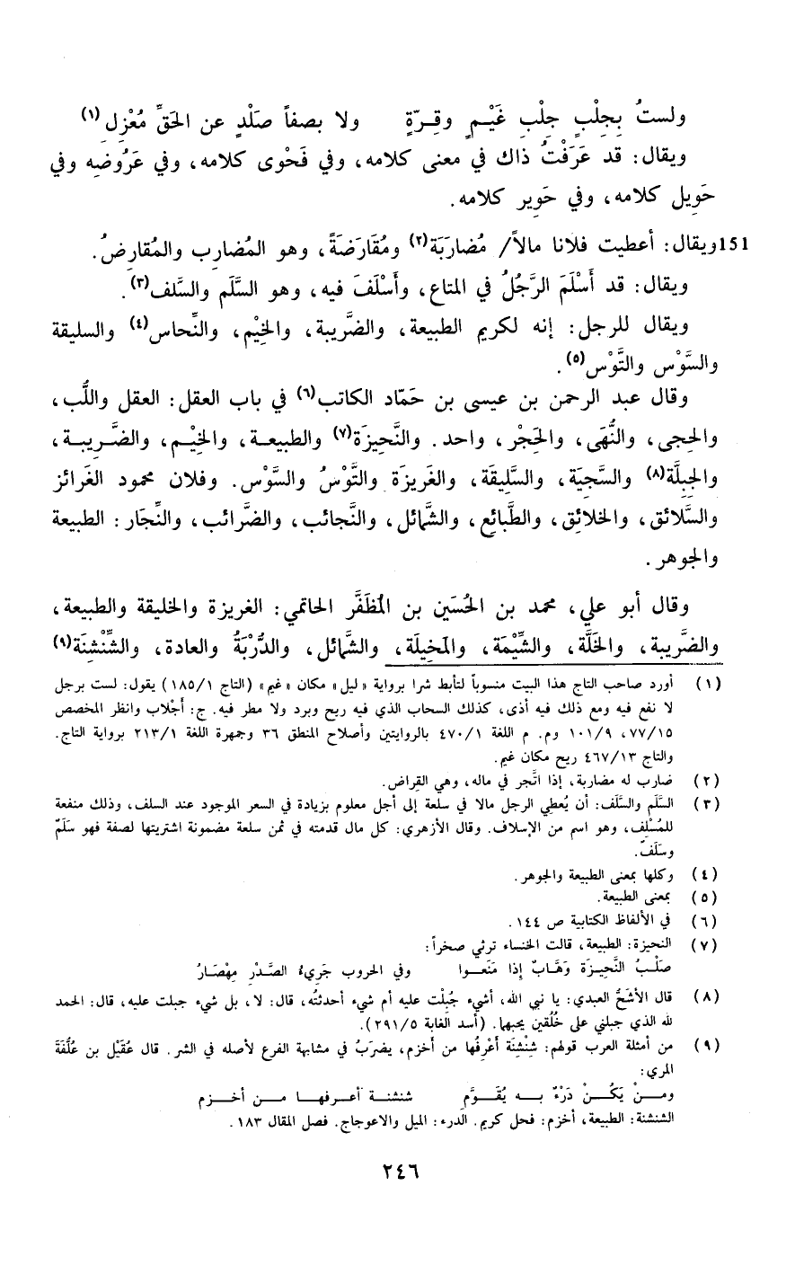 وَيُقَال للرجل إِنَّه لكريم الطبيعة والضريبة والخيم والنحاس والسليقة والسوس والتوس
