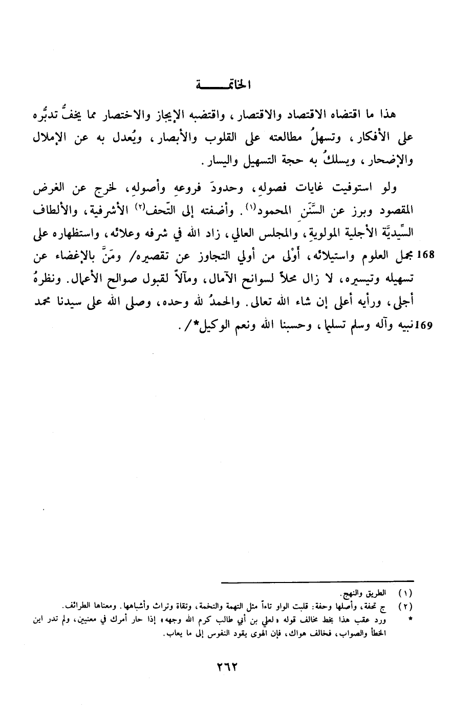 وَلَو استوفيت غايات فصوله وحدود فروعه وأصوله لخرج عَن الْغَرَض الْمَقْصُود وبرز عَن السّنَن الْمَحْمُود وأضفته إِلَى التحف الأشرفية والألطاف السيدية الأجلية المولوية والمجلس العالي زَاد الله فِي شرفه وعلائه واستظهاره على مُجمل الْعُلُوم واستيلائه أولى من أولي التجاوز عَن تَقْصِيره وَمن بالإغضاء عَن تسهيله وتيسيره لَا زَالَ محلا لسوانح الآمال ومآلا لقبُول صوالح الْأَعْمَال ونظرة أجلى ورأيه أَعلَى إِن شَاءَ الله تَعَالَى وَالْحَمْد لله وَحده وَصلى الله على سيدنَا مُحَمَّد نبيه وَآله وَسلم تَسْلِيمًا وحسبنا الله وَنعم الْوَكِيل