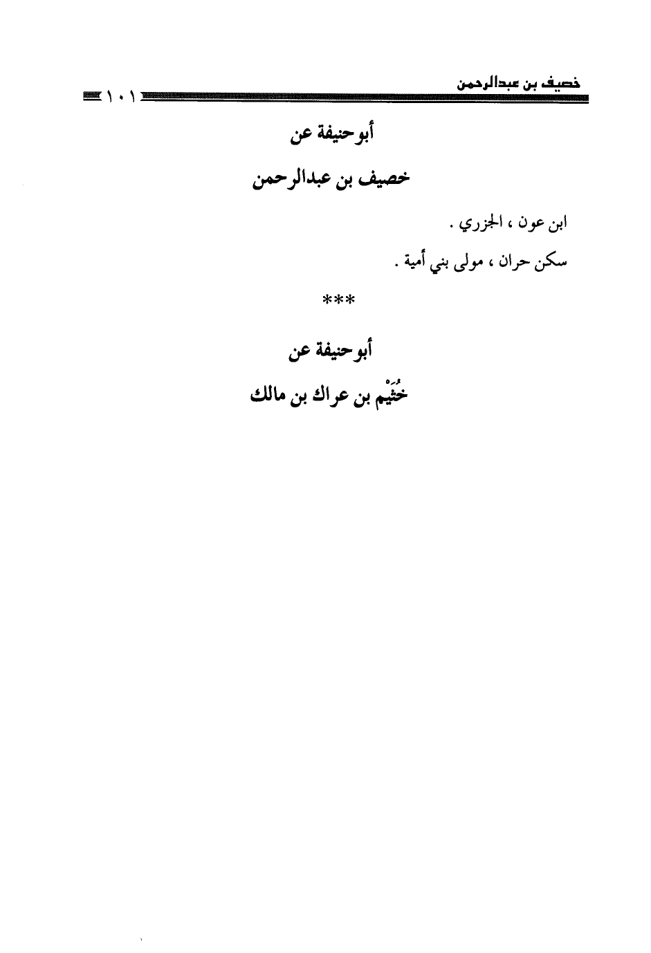 §أَبُو حَنِيفَةَ عَنْ خُصَيْفِ بْنِ عَبْدِ الرَّحْمَنِ أَبُو عَوْنٍ الْجَزَرِيِّ، سَكَنَ حَرَّانَ، مَوْلَى بَنِي أُمَيَّةَ