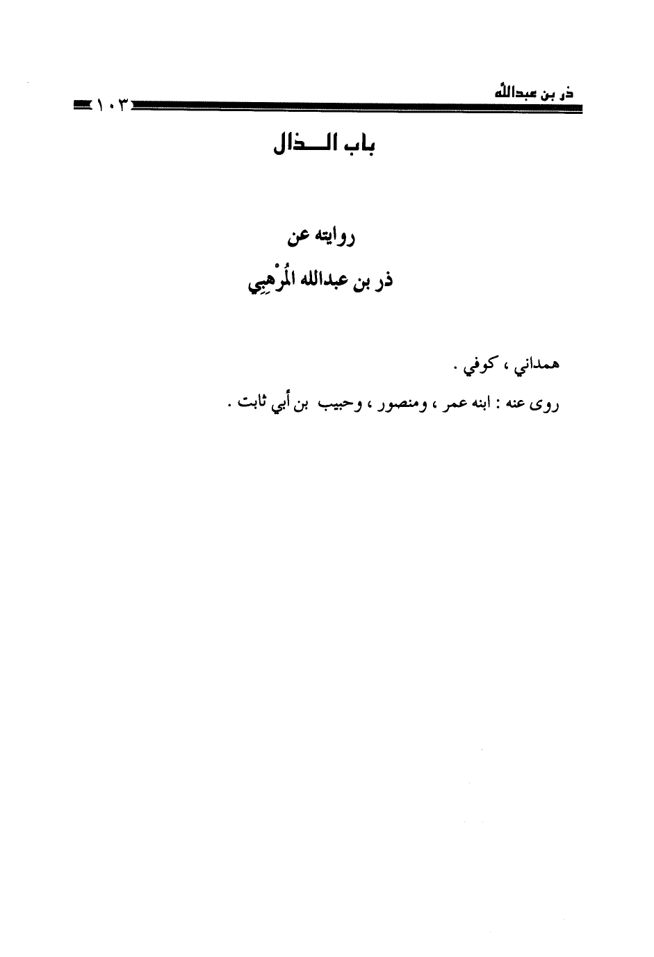 §رِوَايَتُهُ، عَنْ ذَرِّ بْنِ عَبْدِ اللَّهِ الْمُرْهِبِيِّ هَمْدَانِيٌّ كُوفِيٌّ، رَوَى عَنْهُ ابْنُهُ عُمَرُ، وَمَنْصُورٌ، وَحَبِيبُ بْنُ أَبِي ثَابِتٍ