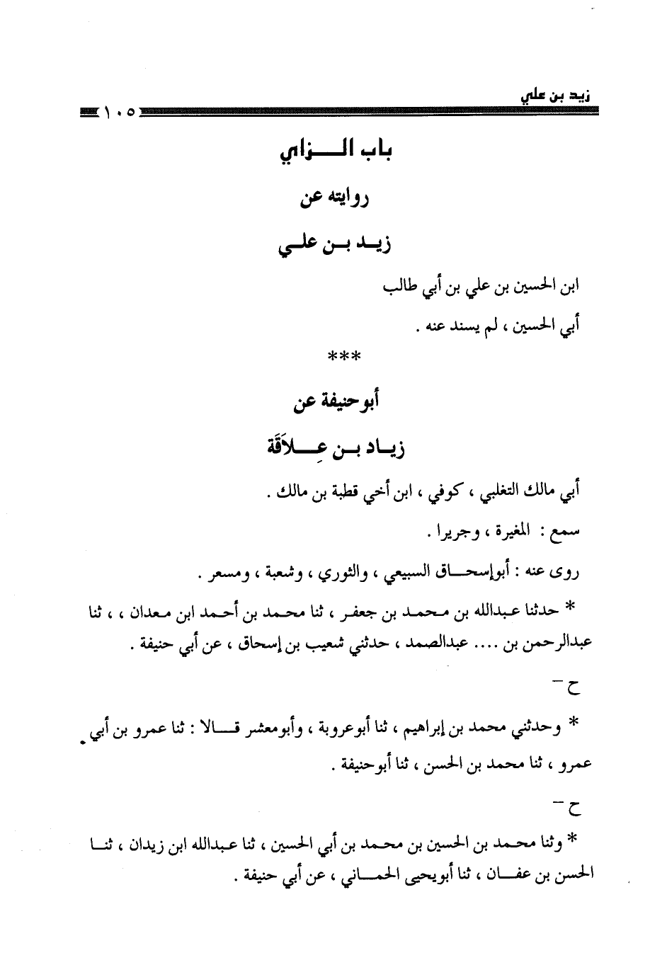 §أَبُو حَنِيفَةَ، عَنْ زِيَادِ بْنِ عِلَاقَةَ أَبِي مَالِكٍ التَّغْلِبِيِّ، كُوفِيٌّ، ابْنُ أَخِي قُطْبَةَ بْنِ مَالِكٍ، سَمِعَ الْمُغِيرَةِ، وَجَرِيرًا، رَوَى عَنْهُ أَبُو إِسْحَاقَ السَّبِيعِيُّ، وَالثَّوْرِيُّ، وَشُعْبَةُ، وَمِسْعَرٌ