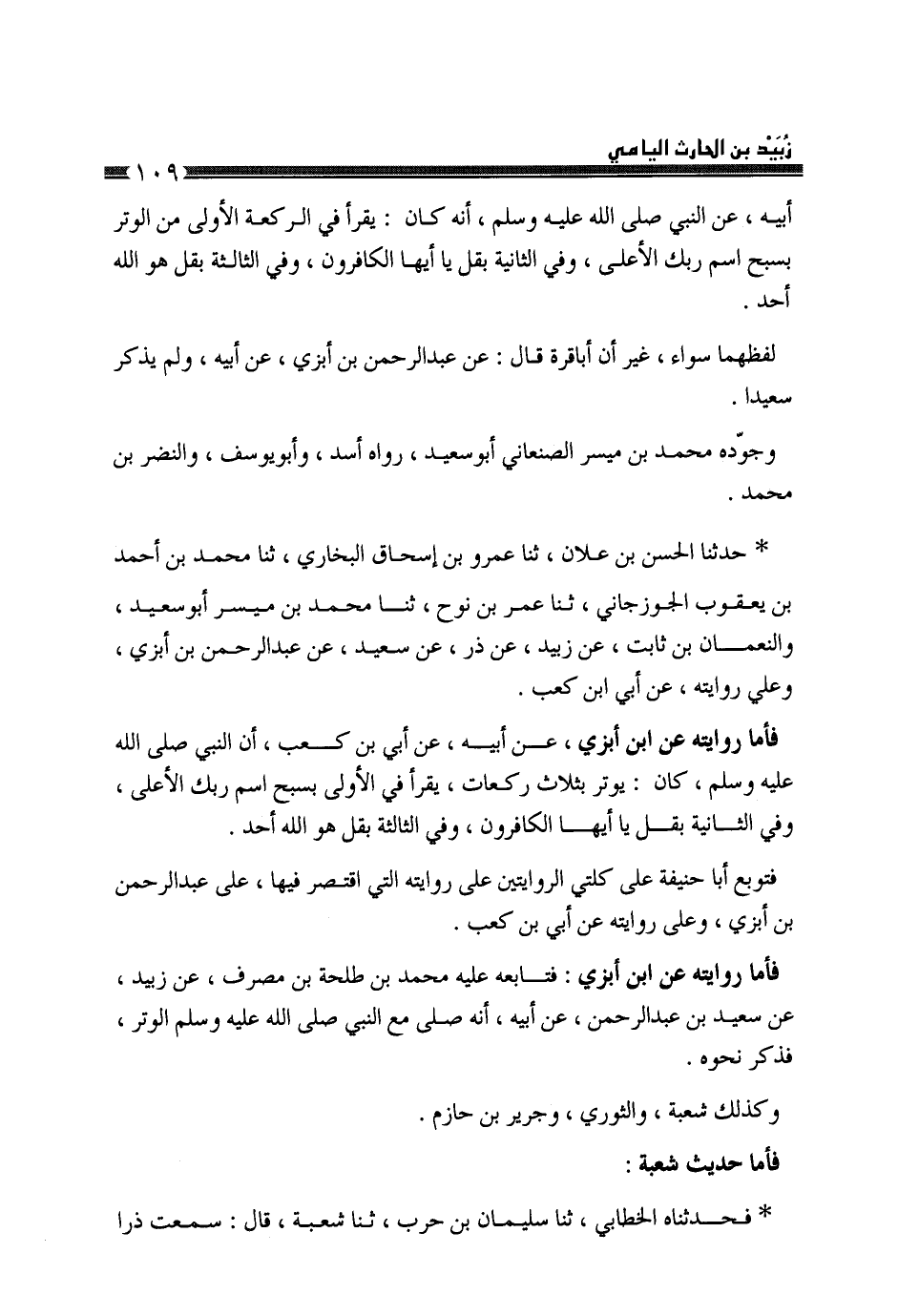حَدَّثَنَا الْحَسَنُ بْنُ عَلَّانَ، ثَنَا عَمْرُو بْنُ إِسْحَاقَ الْبُخَارِيُّ، ثَنَا مُحَمَّدُ بْنُ أَحْمَدَ بْنِ يَعْقُوبَ الْجُوزَجَانِيُّ، ثَنَا عُمَرُ بْنُ نُوحٍ، ثَنَا مُحَمَّدُ بْنُ مُيَسَّرٍ أَبُو سَعِيدٍ، وَالنُّعْمَانُ بْنُ ثَابِتٍ، عَنْ زُبَيْدٍ، عَنْ ذَرٍّ، عَنْ سَعِيدٍ، عَنْ أَبِيهِ، عَنْ أُبَيِّ بْنِ كَعْبٍ، أَنَّ النَّبِيَّ صَلَّى اللهُ عَلَيْهِ وَسَلَّمَ «§كَانَ يُوتِرُ بِثَلَاثِ رَكَعَاتٍ يَقْرَأُ فِي الْأُولَى بِسَبِّحِ اسْمَ رَبِّكَ الْأَعْلَى، وَفِي الثَّانِيَةِ بِقُلْ يَا أَيُّهَا الْكَافِرُونَ وَفِي الثَّالِثَةِ بِقُلْ هُوَ اللَّهُ أَحَدٌ» فَتُوبِعَ أَبُو حَنِيفَةَ عَلَى كِلْتَا الرِّوَايَتَيْنِ، عَلَى رِوَايَتِهِ الَّتِي اقْتَصَرَ فِيهَا عَلَى عَبْدِ الرَّحْمَنِ بْنِ أَبْزَى، وَعَلَى رِوَايَتِهِ عَنْ أُبَيِّ بْنِ كَعْبٍ فَأَمَّا رِوَايَتُهُ، عَنِ ابْنِ أَبْزَى، فَتَابَعَهُ عَلَيْهِ مُحَمَّدُ بْنُ طَلْحَةَ بْنِ مُصَرِّفٍ، عَنْ زُبَيْدٍ، عَنْ سَعِيدِ بْنِ عَبْدِ الرَّحْمَنِ، عَنْ أَبِيهِ، أَنَّهُ صَلَّى مَعَ النَّبِيِّ صَلَّى اللهُ عَلَيْهِ وَسَلَّمَ الْوِتْرَ فَذَكَرَ نَحْوَهُ وَكَذَلِكَ شُعْبَةُ، وَالثَّوْرِيُّ، وَجَرِيرُ بْنُ حَازِمٍ، فَأَمَّا حَدِيثُ شُعْبَةَ، حَدَّثَنَاهُ الْخَطَّابِيُّ، ثَنَا سُلَيْمَانُ بْنُ حَرْبٍ، ثَنَا شُعْبَةُ قَالَ: سَمِعْتُ ذَرًّا -[110]- يُحَدِّثُ عَنْ عَبْدِ الرَّحْمَنِ بْنِ أَبْزَى، عَنْ أَبِيهِ، عَنِ النَّبِيِّ صَلَّى اللهُ عَلَيْهِ وَسَلَّمَ كَانَ يَقْرَأُ بِهِ، وَأَمَّا حَدِيثُ الثَّوْرِيِّ فَإِنَّ سُلَيْمَانَ بْنَ أَحْمَدَ، ثَنَا قَالَ: ثَنَا عَلِيُّ بْنُ عَبْدِ الْعَزِيزِ، ثَنَا أَبُو نُعَيْمٍ، ثَنَا سُفْيَانُ، عَنْ زُبَيْدٍ، عَنْ ذَرٍّ، عَنْ سَعِيدِ بْنِ عَبْدِ الرَّحْمَنِ، رِوَايَتُهُ عَنِ النَّبِيِّ صَلَّى اللهُ عَلَيْهِ وَسَلَّمَ