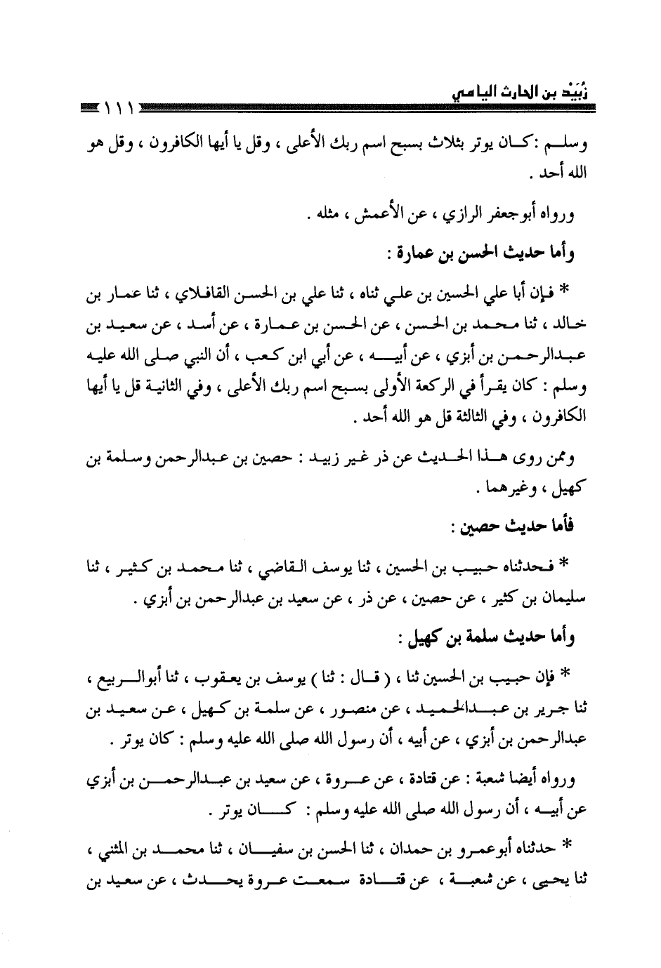 وَأَمَّا حَدِيثُ الْحَسَنِ بْنِ عُمَارَةَ: فَإِنَّ أَبَا عَلِيٍّ الْحُسَيْنَ بْنَ عَلِيٍّ، ثناه، ثَنَا عَلِيُّ بْنُ الْحَسَنِ الْقَافْلَانِيُّ، ثَنَا عَمَّارُ بْنُ خَالِدٍ، ثَنَا مُحَمَّدُ بْنُ الْحَسَنِ، عَنِ الْحَسَنِ بْنِ عُمَارَةَ، عَنْ أَسَدٍ، عَنْ سَعِيدِ بْنِ عَبْدِ الرَّحْمَنِ بْنِ أَبْزَى، عَنْ أَبِيهِ، عَنْ أُبَيِّ بْنِ كَعْبٍ أَنَّ النَّبِيَّ صَلَّى اللهُ عَلَيْهِ وَسَلَّمَ " §كَانَ يَقْرَأُ فِي الرَّكْعَةِ الْأُولَى بِسَبِّحِ اسْمَ رَبِّكَ الْأَعْلَى وَفِي الثَّانِيَةِ قُلْ يَا أَيُّهَا الْكَافِرُونَ، وَفِي الثَّالِثَةِ قُلْ هُوَ اللَّهُ أَحَدٌ وَمِمَّنْ رَوَى هَذَا الْحَدِيثَ، عَنْ ذَرٍّ غَيْرُ زُبَيْدٍ حُصَيْنُ بْنُ عَبْدِ الرَّحْمَنِ، وَسَلَمَةُ بْنُ كُهَيْلٍ، وَغَيْرُهُمْ فَأَمَّا حَدِيثُ حُصَيْنٍ: فَحَدَّثَنَاهُ حَبِيبُ بْنُ الْحُسَيْنِ، ثَنَا يُوسُفُ الْقَاضِي، ثَنَا مُحَمَّدُ بْنُ كَثِيرٍ، ثَنَا سُلَيْمَانُ بْنُ كَثِيرٍ، عَنْ حُصَيْنٍ، عَنْ ذَرٍّ، عَنْ سَعِيدِ بْنِ عَبْدِ الرَّحْمَنِ بْنِ أَبْزَى