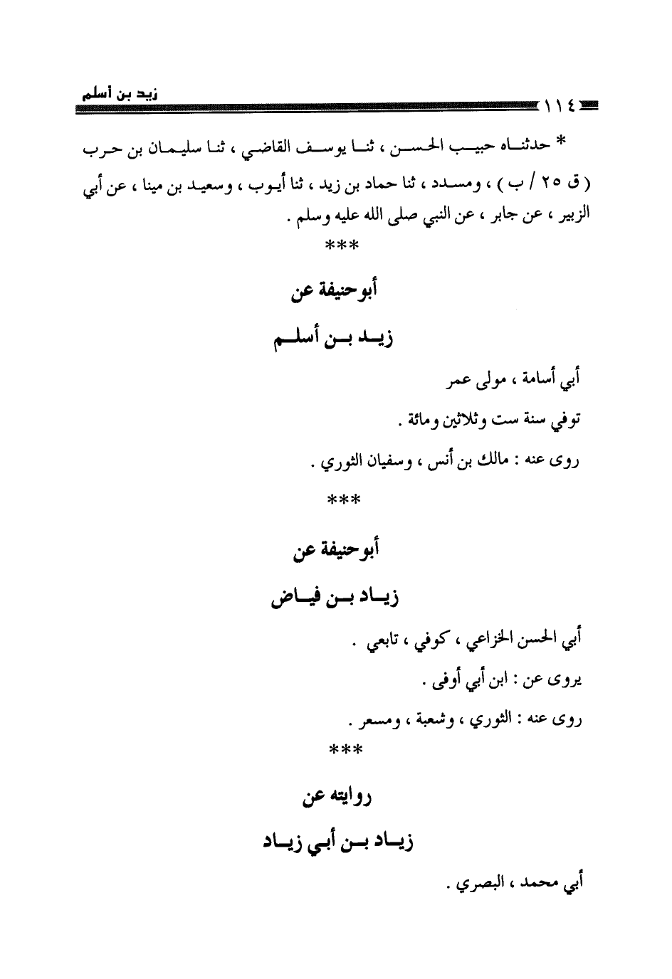 §أَبُو حَنِيفَةَ، عَنْ زَيْدِ بْنِ أَسْلَمَ أَبِي أُسَامَةَ، مَوْلَى عُمَرَ تُوُفِّيَ سَنَةَ سِتٍّ وَثَلَاثِينَ وَمِائَةٍ، رَوَى عَنْهُ مَالِكُ بْنُ أَنَسٍ، وَسُفْيَانُ الثَّوْرِيُّ