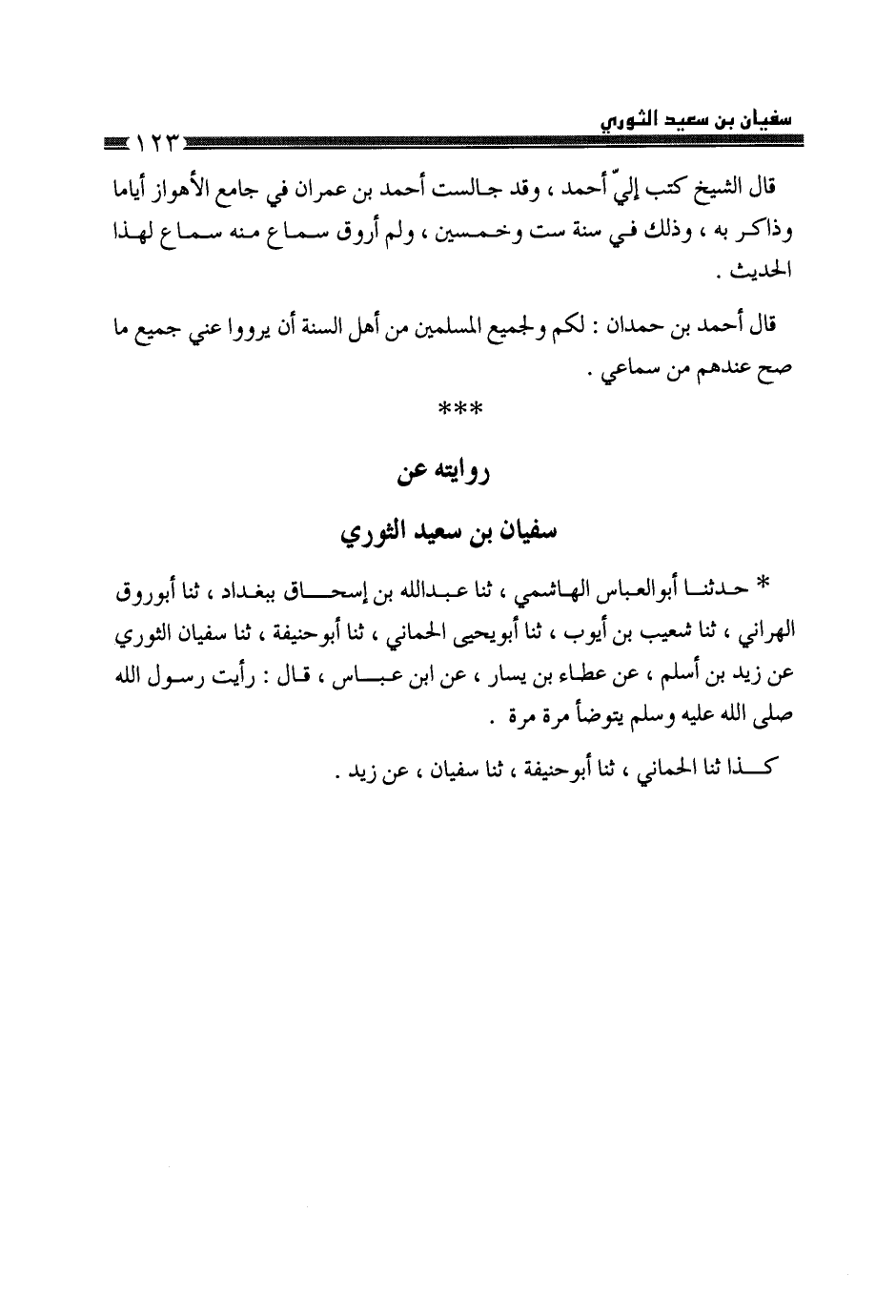 حَدَّثَنَا أَبُو الْعَبَّاسِ الْهَاشِمِيُّ، ثَنَا عَبْدُ اللَّهِ بْنُ إِسْحَاقَ، بِبَغْدَادَ، ثَنَا أَبُو رَوْقٍ الْهَزَّانِيُّ، ثَنَا شُعَيْبُ بْنُ أَيُّوبَ، ثَنَا أَبُو يَحْيَى الْحِمَّانِيُّ، ثَنَا أَبُو حَنِيفَةَ، ثَنَا سُفْيَانُ الثَّوْرِيُّ، عَنْ زَيْدِ بْنِ أَسْلَمَ، عَنْ عَطَاءِ بْنِ يَسَارٍ، عَنِ ابْنِ عَبَّاسٍ، قَالَ: «§رَأَيْتُ رَسُولَ اللَّهِ صَلَّى اللهُ عَلَيْهِ وَسَلَّمَ يَتَوَضَّأُ مَرَّةً مَرَّةً» كَذَا، ثَنَا الْحِمَّانِيُّ، ثَنَا أَبُو حَنِيفَةَ، ثَنَا سُفْيَانُ، عَنْ زَيْدٍ