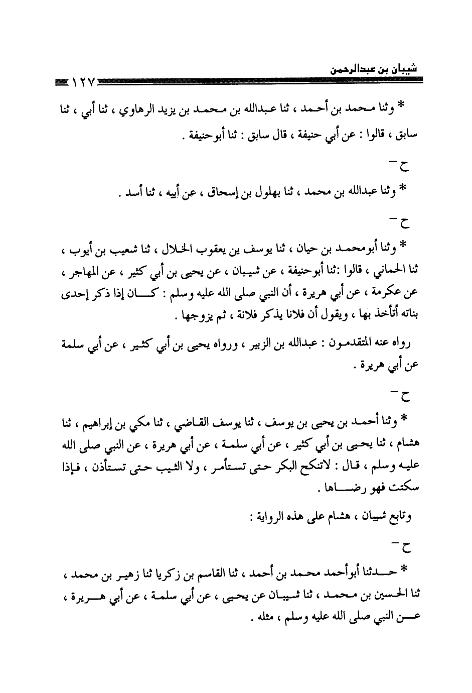 وَثنا مُحَمَّدُ بْنُ أَحْمَدَ، ثَنَا عَبْدُ اللَّهِ بْنُ مُحَمَّدِ بْنِ يَزِيدَ الرُّهَاوِيُّ، ثَنَا أَبِي، ثَنَا سَابِقٌ، قَالُوا: عَنْ أَبِي حَنِيفَةَ، قَالَ سَابِقٌ: ثَنَا أَبُو حَنِيفَةَ، ح وَثنا عَبْدُ اللَّهِ بْنُ مُحَمَّدٍ، ثَنَا بُهْلُولُ بْنُ إِسْحَاقَ، عَنْ أَبِيهِ، ثَنَا أَسَدٌ، ح وَثنا أَبُو مُحَمَّدِ بْنُ حَيَّانَ، ثَنَا يُوسُفُ بْنُ يَعْقُوبَ الْخَلَّالُ، ثَنَا شُعَيْبُ بْنُ أَيُّوبَ، ثَنَا الْحِمَّانِيُّ، قَالُوا: ثَنَا أَبُو حَنِيفَةَ، عَنْ شَيْبَانَ، عَنْ يَحْيَى بْنِ أَبِي كَثِيرٍ، عَنِ الْمُهَاجِرِ، عَنْ عِكْرِمَةَ، عَنْ أَبِي هُرَيْرَةَ، أَنَّ النَّبِيَّ صَلَّى اللهُ عَلَيْهِ وَسَلَّمَ «§كَانَ إِذَا ذَكَرَ إِحْدَى بَنَاتِهِ أَتَأْخُذُ بِهَا، وَيَقُولُ إِنَّ فُلَانًا يَذْكُرُ فُلَانَةَ، ثُمَّ يُزَوِّجُهَا» رَوَاهُ عَنْهُ الْمُتَقَدِّمُونَ: عَبْدُ اللَّهِ بْنُ الزُّبَيْرِ، وَرَوَاهُ يَحْيَى بْنُ أَبِي كَثِيرٍ، عَنْ أَبِي سَلَمَةَ، عَنْ أَبِي هُرَيْرَةَ