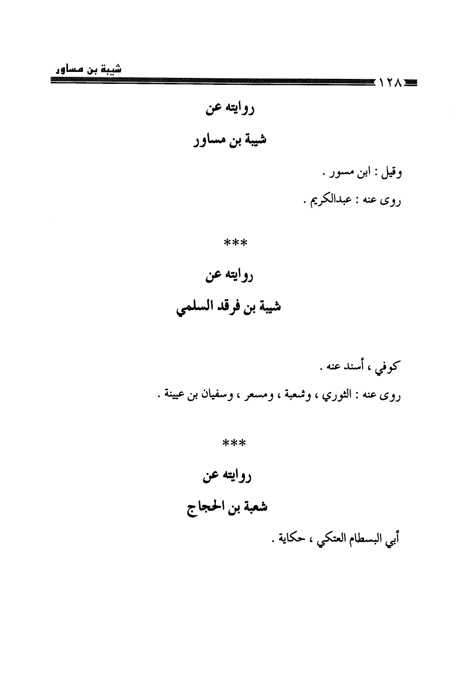 §رِوَايَتُهُ، عَنْ شَيْبَةَ بْنِ مُسَاوِرٍ وَقِيلَ: ابْنُ مِسْوَرٍ، رَوَى عَنْهُ عَبْدُ الْكَرِيمِ
