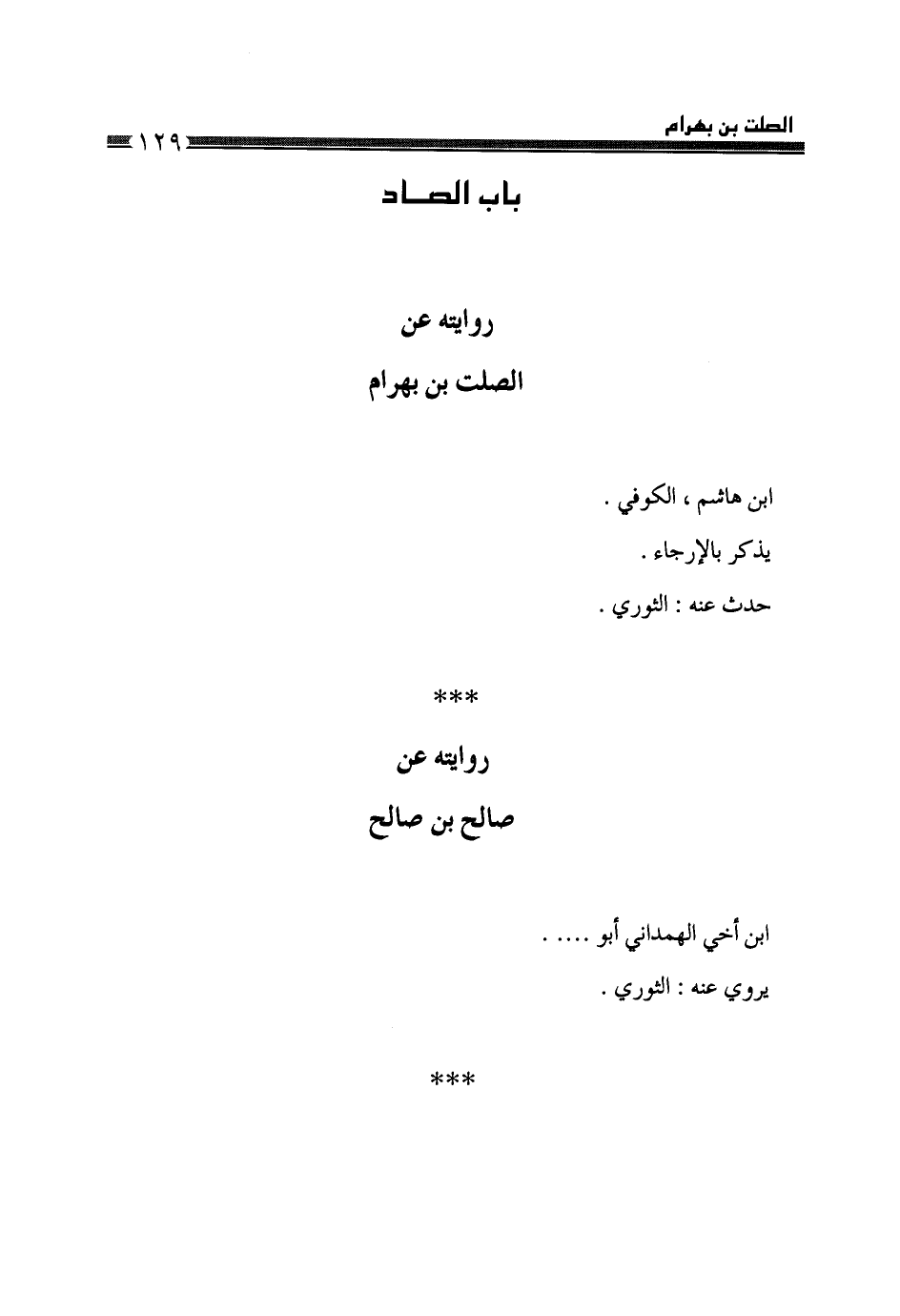 §رِوَايَتُهُ، عَنِ الصَّلْتِ بْنِ بَهْرَامَ بْنِ هَاشِمٍ الْكُوفِيِّ، يُذْكَرُ بِالْإِرْجَاءِ حَدَّثَ عَنْهُ الثَّوْرِيُّ