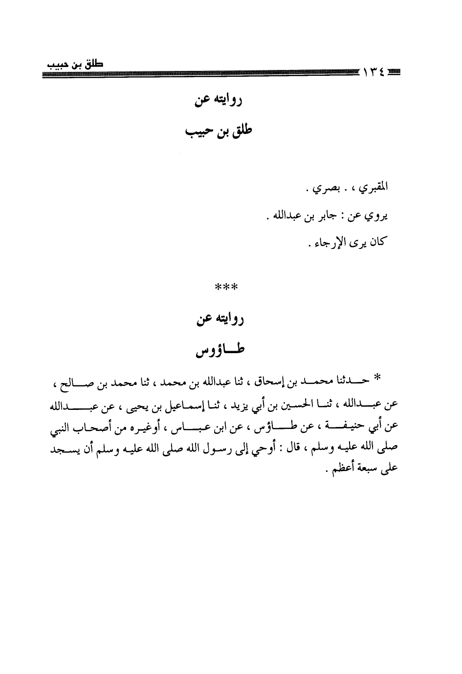 §رِوَايَتُهُ، عَنْ طَلْقِ بْنِ حَبِيبٍ الْمَقْبُرِيِّ بَصْرِيٌّ يَرْوِي عَنْ جَابِرِ بْنِ عَبْدِ اللَّهِ، كَانَ يَرَى الْإِرْجَاءَ