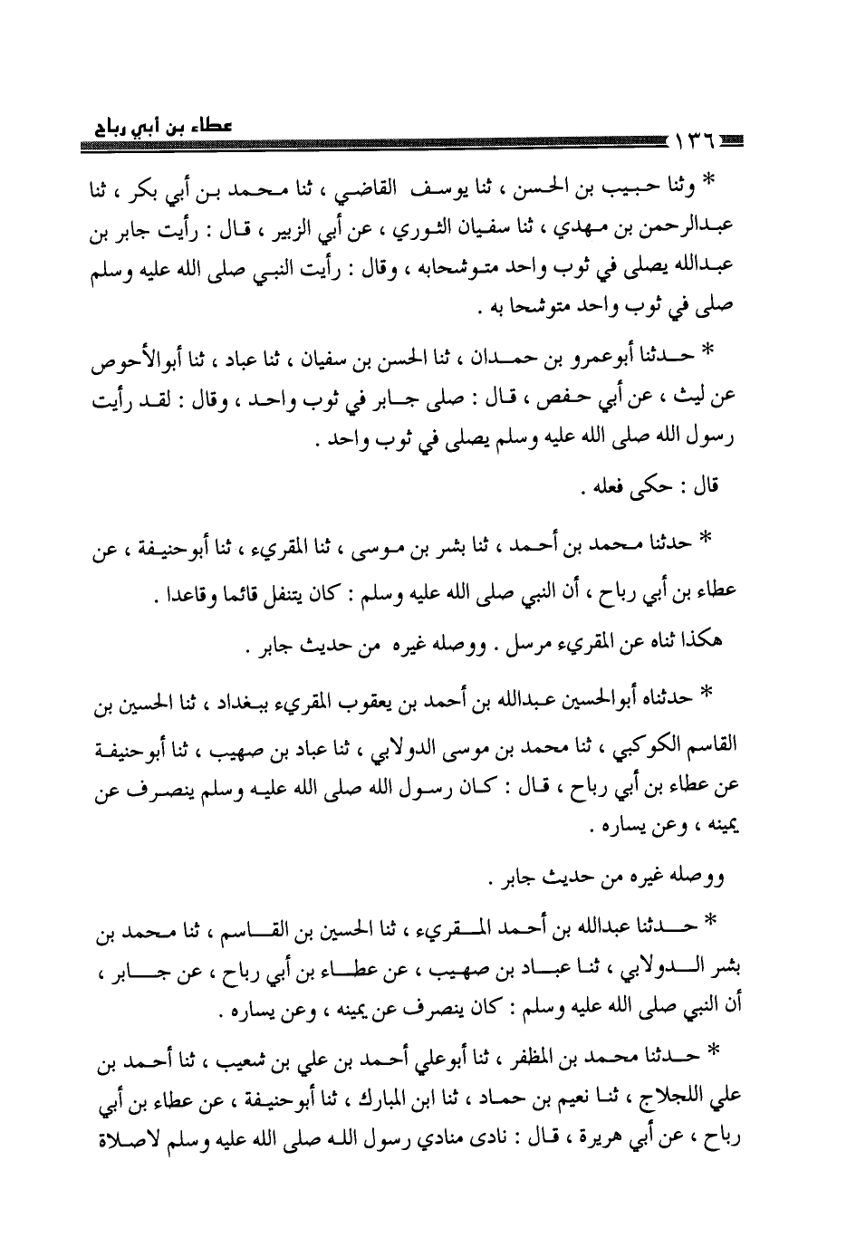 حَدَّثَنَاهُ أَبُو الْحُسَيْنِ عَبْدُ اللَّهِ بْنُ أَحْمَدَ بْنِ يَعْقُوبَ الْمُقْرِئُ، بِبَغْدَادَ، ثَنَا الْحُسَيْنُ بْنُ الْقَاسِمِ الْكَوْكَبِيُّ، ثَنَا مُحَمَّدُ بْنُ مُوسَى الدَّوْلَابِيُّ، ثَنَا عَبَّادُ بْنُ صُهَيْبٍ، ثَنَا أَبُو حَنِيفَةَ، عَنْ عَطَاءِ بْنِ أَبِي رَبَاحٍ، قَالَ: «كَانَ رَسُولُ اللَّهِ صَلَّى اللهُ عَلَيْهِ وَسَلَّمَ §يَنْصَرِفُ، عَنْ يَمِينِهِ، وَعَنْ يَسَارِهِ» وَوَصَلَهُ غَيْرُهُ مِنْ حَدِيثِ جَابِرٍ