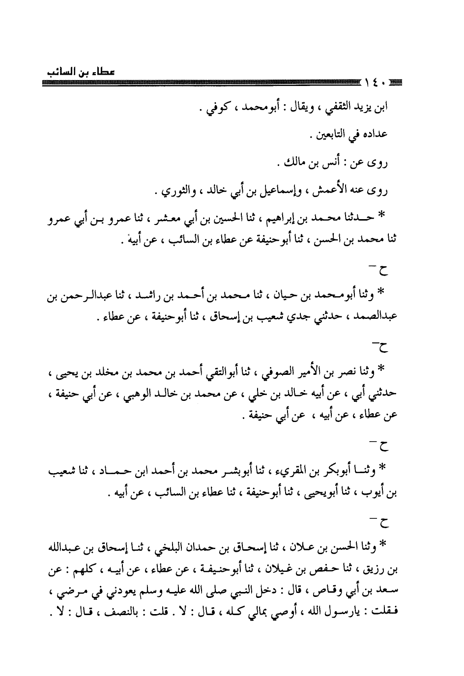 حَدَّثَنَا مُحَمَّدُ بْنُ إِبْرَاهِيمَ، ثَنَا الْحُسَيْنُ بْنُ أَبِي مَعْشَرٍ، ثَنَا عَمْرُو بْنُ أَبِي عَمْرٍو، ثَنَا مُحَمَّدُ بْنُ الْحَسَنِ، ثَنَا أَبُو حَنِيفَةَ، عَنْ عَطَاءِ بْنِ السَّائِبِ، عَنْ أَبِيهِ، ح وَثنا أَبُو مُحَمَّدِ بْنُ حَيَّانَ، ثَنَا مُحَمَّدُ بْنُ أَحْمَدَ بْنِ رَاشِدٍ، ثَنَا عَبْدُ الرَّحْمَنِ بْنُ عَبْدِ الصَّمَدِ، حَدَّثَنِي جَدِّي شُعَيْبُ بْنُ إِسْحَاقَ، ثَنَا أَبُو حَنِيفَةَ، عَنْ عَطَاءٍ، ح وَثنا نَصْرُ بْنُ الْأَمِيرِ الصُّوفِيُّ، ثَنَا أَبُو التَّقِيِّ أَحْمَدُ بْنُ مُحَمَّدِ بْنِ مَخْلَدِ بْنِ يَحْيَى، حَدَّثَنِي أَبِي، عَنْ أَبِيهِ، خَالِدِ بْنِ خَلِيٍّ، عَنْ مُحَمَّدِ بْنِ خَالِدٍ الْوَهْبِيِّ، عَنْ أَبِي حَنِيفَةَ، عَنْ عَطَاءٍ، عَنْ أَبِيهِ، عَنْ أَبِي حَنِيفَةَ، ح وَثنا أَبُو بَكْرِ بْنُ الْمُقْرِئِ، ثَنَا أَبُو بِشْرٍ مُحَمَّدُ بْنُ أَحْمَدَ بْنِ حَمَّادٍ، ثَنَا شُعَيْبُ بْنُ أَيُّوبَ، ثَنَا أَبُو يَحْيَى، ثَنَا أَبُو حَنِيفَةَ، ثَنَا عَطَاءُ بْنُ السَّائِبِ، عَنْ أَبِيهِ، ح وَثنا الْحَسَنُ بْنُ عَلَّانَ، ثَنَا إِسْحَاقُ بْنُ حَمْدَانَ الْبَلْخِيُّ، ثَنَا إِسْحَاقُ بْنُ عَبْدِ اللَّهِ بْنِ رُزَيْقٍ، ثَنَا حَفْصُ بْنُ غَيْلَانَ، ثَنَا أَبُو حَنِيفَةَ، عَنْ عَطَاءٍ، عَنْ أَبِيهِ، كُلُّهُمْ، عَنْ سَعْدِ بْنِ أَبِي وَقَّاصٍ، قَالَ: دَخَلَ النَّبِيُّ صَلَّى اللهُ عَلَيْهِ وَسَلَّمَ يَعُودُنِي فِي مَرَضِي، فَقُلْتُ: يَا رَسُولَ اللَّهِ أُوصِي بِمَالِي كُلِّهِ؟ قَالَ: «لَا» ، قُلْتُ: بِالنِّصْفِ؟ قَالَ: «لَا» . -[141]- قُلْتُ: الثُّلُثُ؟ قَالَ: «الثُّلُثُ، وَالثُّلُثُ كَثِيرٌ، §وَلَا تَدَعْ أَهْلَكَ يَتَكَفَّفُونَ النَّاسَ» وَرَوَاهُ جَرِيرٌ، وَخَالِدُ بْنُ عَبْدِ اللَّهِ الْوَاسِطِيُّ، وَغَيْرُهُمَا قَالُوا: عَنْ عَطَاءِ بْنِ السَّائِبِ، عَنْ أَبِي عَبْدِ الرَّحْمَنِ، عَنْ سَعْدِ بْنِ مَالِكٍ، نَحْوَهُ وَرَوَاهُ حَمْزَةُ الزَّيَّاتُ، وَحَمَّادُ بْنُ أَبِي حَنِيفَةَ، وَعَبْدُ اللَّهِ بْنُ الزُّبَيْرِ، وَالْحَسَنُ بْنُ زِيَادٍ