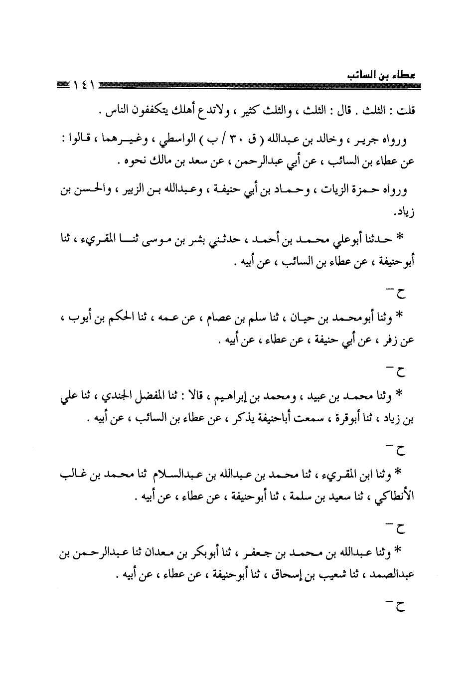 حَدَّثَنَا أَبُو عَلِيٍّ مُحَمَّدُ بْنُ أَحْمَدَ، حَدَّثَنِي بِشْرُ بْنُ مُوسَى، ثَنَا الْمُقْرِئُ، ثَنَا أَبُو حَنِيفَةَ، عَنْ عَطَاءِ بْنِ السَّائِبِ، عَنْ أَبِيهِ، ح وَثنا أَبُو مُحَمَّدِ بْنُ حَيَّانَ، ثَنَا سَلْمُ بْنُ عِصَامٍ، عَنْ عَمِّهِ، ثَنَا الْحَكَمُ بْنُ أَيُّوبَ، عَنْ زُفَرَ، عَنْ أَبِي حَنِيفَةَ، عَنْ عَطَاءٍ، عَنْ أَبِيهِ، ح وَثنا مُحَمَّدُ بْنُ عُبَيْدٍ، وَمُحَمَّدُ بْنُ إِبْرَاهِيمَ، قَالَا: ثَنَا الْمُفَضَّلُ الْجَنَدِيُّ، ثَنَا عَلِيُّ بْنُ زِيَادٍ، ثَنَا أَبُو قُرَّةَ، سَمِعْتُ أَبَا حَنِيفَةَ، يَذْكُرُ عَنْ عَطَاءِ بْنِ السَّائِبِ، عَنْ أَبِيهِ، ح وَثنا ابْنُ الْمُقْرِئِ، ثَنَا مُحَمَّدُ بْنُ عَبْدِ اللَّهِ بْنِ عَبْدِ السَّلَامِ، ثَنَا مُحَمَّدُ بْنُ غَالِبٍ الْأَنْطَاكِيُّ، ثَنَا سَعِيدُ بْنُ سَلَمَةَ، ثَنَا أَبُو حَنِيفَةَ، عَنْ عَطَاءٍ، عَنْ أَبِيهِ، ح وَثنا عَبْدُ اللَّهِ بْنُ مُحَمَّدِ بْنِ جَعْفَرٍ، ثَنَا أَبُو بَكْرِ بْنُ مَعْدَانَ، ثَنَا عَبْدُ الرَّحْمَنِ بْنُ عَبْدِ الصَّمَدِ، ثَنَا شُعَيْبُ بْنُ إِسْحَاقَ، ثَنَا أَبُو حَنِيفَةَ، عَنْ عَطَاءٍ، عَنْ أَبِيهِ، -[142]- ح وَثنا الْحَسَنُ بْنُ عَلَّانَ، ثَنَا عُمَرُ بْنُ الْحَسَنِ الْقَاضِي، ثَنَا عُبَيْدُ بْنُ كَثِيرٍ، ثَنَا الْوَلِيدُ بْنُ حَمَّادٍ، عَنِ الْحَسَنِ بْنِ زِيَادٍ، عَنْ أَبِي حَنِيفَةَ، عَنْ عَطَاءِ بْنِ السَّائِبِ، عَنْ أَبِيهِ، كُلُّهُمْ قَالَ: عَنْ عَبْدِ اللَّهِ بْنِ عَمْرِو بْنِ الْعَاصِ، قَالَ: انْكَسَفَتِ الشَّمْسُ يَوْمَ مَاتَ إِبْرَاهِيمُ ابْنُ النَّبِيِّ صَلَّى اللهُ عَلَيْهِ وَسَلَّمَ، فَقَالَ نَاسٌ مِنَ النَّاسِ: انْكَسَفَتِ الشَّمْسُ لِمَوْتِ إِبْرَاهِيمَ، فَقَامَ فَأَطَالَ الْقِيَامَ حَتَّى ظَنَنَّا أَنْ لَا يَرْكَعَ، ثُمَّ رَكَعَ وَكَانَ رُكُوعُهُ قَدْرَ قِيَامِهِ، ثُمَّ رَفَعَ رَأْسَهُ مِنَ الرُّكُوعِ قَدْرَ رُكُوعِهِ، ثُمَّ سَجَدَ فَكَانَ سُجُودُهُ قَدْرَ قِيَامِهِ، ثُمَّ رَفَعَ رَأْسَهُ مِنَ السُّجُودِ، ثُمَّ سَجَدَ الثَّانِيَةَ عَلَى مِثْلِ ذَلِكَ، ثُمَّ صَلَّى الرَّكْعَةَ الثَّانِيَةَ عَلَى مِثْلِ ذَلِكَ، فَلَمَّا كَانَ فِي السَّجْدَةِ الْأَخِيرَةِ بَكَى فَاشْتَدَّ بُكَاؤُهُ، فَسَمِعْنَاهُ وَهُوَ يَقُولُ: «اللَّهُمَّ إِنَّكَ تَعِدُنِي أَنْ لَا تُعَذِّبَهُمْ وَأَنَا فِيهِمْ» ، ثُمَّ جَلَسَ فَتَشَهَّدَ، ثُمَّ انْصَرَفَ فَأَقْبَلَ عَلَيْنَا بِوَجْهِهِ وَقَالَ: «§إِنَّ الشَّمْسَ وَالْقَمَرَ آيَتَانِ مِنْ آيَاتِ اللَّهِ، لَا تَنْكَسِفَانِ لِمَوْتِ أَحَدٍ وَلَا لِحَيَاتِهِ، فَإِذَا كَانَ ذَلِكَ فَعَلَيْكُمْ بِالصَّلَاةِ، وَلَقَدْ رَأَيْتُنِي أُدْنِيتُ الْجَنَّةَ حَتَّى لَوْ شِئْتُ أَتَنَاوَلُ مِنْ أَغْصَانِهَا فَعَلْتُ، وَلَقَدْ رَأَيْتُنِي أُدْنِيتُ مِنَ النَّارِ حَتَّى جَعَلْتُ أُلْقِيَ لَهَبُهَا عَلَيَّ وَعَلَيْكُمْ، وَلَقَدْ رَأَيْتُ مَشَارِقَ.. . رَسُولِ اللَّهِ صَلَّى اللهُ عَلَيْهِ وَسَلَّمَ يُعَذَّبُ فِي النَّارِ، وَلَقَدْ رَأَيْتُ فِيهَا.. . حَتَّى إِذَا خَفِيَ لَهُ شَيْءٌ ذَهَبَ، يَقُولُونَ: ذَهَبَ عَلَيْهِ قَالَ: وَلَقَدْ رَأَيْتُ فِيهَا امْرَأَةً طَوِيلَةً تُعَذَّبُ فِي هِرَّةٍ لَهَا رَبَطَتْهَا فَلَمْ تُطْعِمْهَا وَلَمْ تَسْقِهَا وَلَمْ تَدَعْهَا تَأْكُلُ مِنْ خَشَاشِ الْأَرْضِ» إِسْنَادُ بِشْرِ بْنِ مُوسَى، عَنِ الْمُقْرِئِ وَرَوَاهُ الْحَسَنُ بْنُ الْفُرَاتِ، وَأَبُو يُوسُفَ، وَأَسَدُ بْنُ عَمْرٍو، وَسَعِيدُ بْنُ إِبْرَاهِيمَ، وَأَيُّوبُ بْنُ هَانِئٍ، وَالْحَسَنُ بْنُ زِيَادٍ، وَشُعَيْبُ بْنُ إِسْحَاقَ، وَعَبْدُ اللَّهِ بْنُ الزُّبَيْرِ تَابَعَهُ زَيْدُ بْنُ أَبِي أُنَيْسَةَ، عَنْ عَطَاءِ بْنِ السَّائِبِ، مِثْلَهُ بِطُولِهِ حَدَّثَ