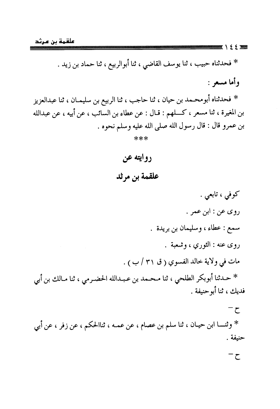 §رِوَايَتُهُ، عَنْ عَلْقَمَةَ بْنِ مَرْثَدٍ، كُوفِيٌّ تَابِعِيٌّ، رَوَى عَنِ ابْنِ عُمَرَ سَمِعَ عَطَاءً، وَسُلَيْمَانَ بْنَ بُرَيْدَةَ، رَوَى عَنْهُ الثَّوْرِيُّ، وَشُعْبَةُ مَاتَ فِي وِلَايَةِ خَالِدٍ الْفَسَوِيِّ