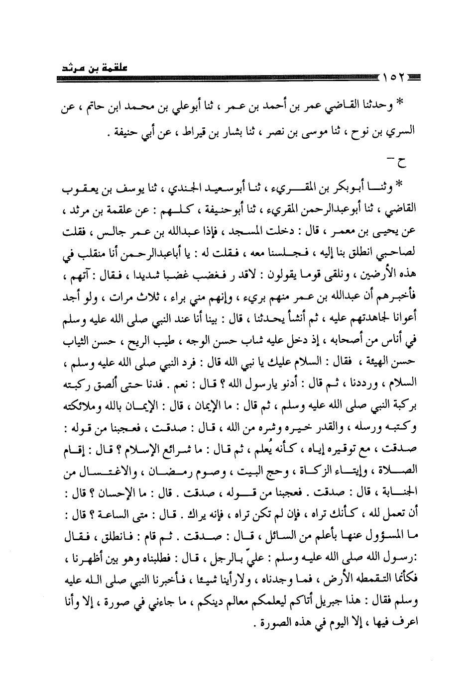 وَحَدَّثَنَا الْقَاضِي عُمَرُ بْنُ أَحْمَدَ بْنِ عُمَرَ، ثَنَا أَبُو عَلِيِّ بْنُ مُحَمَّدِ بْنِ حَاتِمٍ، عَنِ السَّرِيِّ بْنِ نُوحٍ، ثَنَا مُوسَى بْنُ نَصْرٍ، ثَنَا بَشَّارُ بْنُ قِيرَاطٍ، عَنْ أَبِي حَنِيفَةَ، ح وَثنا أَبُو بَكْرِ بْنُ الْمُقْرِئِ، ثَنَا أَبُو سَعِيدٍ الْجَنَدِيُّ، ثَنَا يُوسُفُ بْنُ يَعْقُوبَ الْقَاضِي، ثَنَا أَبُو عَبْدِ الرَّحْمَنِ الْمُقْرِئِ، ثَنَا أَبُو حَنِيفَةَ، كُلُّهُمْ عَنْ عَلْقَمَةَ بْنِ مَرْثَدٍ، عَنْ يَحْيَى بْنِ مَعْمَرٍ، قَالَ: دَخَلْتُ الْمَسْجِدَ فَإِذَا عَبْدُ اللَّهِ بْنُ عُمَرَ جَالِسٌ فَقُلْتُ لِصَاحِبِي: انْطَلِقْ بِنَا إِلَيْهِ، فَجَلَسْنَا مَعَهُ، فَقُلْتُ لَهُ: يَا أَبَا عَبْدِ الرَّحْمَنِ أَنَا مُنْقَلِبٌ فِي هَذِهِ الْأَرَضِينَ، وَنَلْقَى قَوْمًا يَقُولُونَ: لَا قَدَرَ، فَغَضِبَ غَضَبًا شَدِيدًا فَقَالَ: آتِهِمْ فَأَخْبِرْهُمْ أَنَّ عَبْدَ اللَّهِ بْنَ عُمَرَ مِنْهُمْ بَرِيءٌ، وَإِنَّهُمْ مِنِّي بَرَاءٌ، ثَلَاثَ مَرَّاتٍ، وَلَوْ أَجِدُ أَعْوَانًا لَجَاهَدْتُهُمْ عَلَيْهِ، ثُمَّ أَنْشَأَ يُحَدِّثُنَا قَالَ: بَيْنَا أَنَا عِنْدَ النَّبِيِّ صَلَّى اللهُ عَلَيْهِ وَسَلَّمَ فِي أُنَاسٍ مِنْ أَصْحَابِهِ، إِذْ دَخَلَ عَلَيْهِ شَابٌّ حَسَنُ الْوَجْهِ، طَيِّبُ الرِّيحِ، حَسَنُ الثِّيَابِ، حَسَنُ الْهَيْئَةِ، فَقَالَ: السَّلَامُ عَلَيْكَ يَا نَبِيَّ اللَّهِ، قَالَ: فَرَدَّ النَّبِيُّ صَلَّى اللهُ عَلَيْهِ وَسَلَّمَ السَّلَامَ وَرَدَدْنَا، ثُمَّ قَالَ: أَدْنُو يَا رَسُولَ اللَّهِ؟ قَالَ: «نَعَمْ» ، فَدَنَا حَتَّى أَلْصَقَ رُكْبَتَيْهِ بِرُكْبَةِ النَّبِيِّ صَلَّى اللهُ عَلَيْهِ وَسَلَّمَ، ثُمَّ قَالَ: مَا الْإِيمَانُ؟ قَالَ: «الْإِيمَانُ بِاللَّهِ وَمَلَائِكَتِهِ، وَكُتُبِهِ وَرُسُلِهِ وَالْقَدَرِ خَيْرِهِ وَشَرِّهِ مِنَ اللَّهِ» ، قَالَ: صَدَقْتَ، فَعَجِبْنَا مِنْ قَوْلِهِ: صَدَقْتَ مَعَ تَوْقِيرِهِ إِيَّاهُ كَأَنَّهُ يَعْلَمُ، ثُمَّ قَالَ: مَا شَرَائِعُ الْإِسْلَامِ؟ قَالَ: إِقَامُ الصَّلَاةِ، وَإِيتَاءُ الزَّكَاةِ، وَحَجُّ الْبَيْتِ، وَصَوْمُ رَمَضَانَ، وَالِاغْتِسَالُ مِنَ الْجَنَابَةِ «، قَالَ: صَدَقْتَ فَعَجِبْنَا مِنْ قَوْلِهِ: صَدَقْتَ، قَالَ: مَا الْإِحْسَانُ؟ قَالَ:» أَنْ تَعْمَلَ لِلَّهِ كَأَنَّكَ تَرَاهُ فَإِنْ لَمْ تَكُنْ تَرَاهُ فَإِنَّهُ يَرَاكَ «، قَالَ: مَتَى السَّاعَةُ؟ قَالَ:» مَا الْمَسْئُولُ عَنْهَا بِأَعْلَمَ مِنَ السَّائِلِ «قَالَ: صَدَقْتَ، ثُمَّ قَامَ فَانْطَلَقَ فَقَالَ رَسُولُ اللَّهِ صَلَّى اللهُ عَلَيْهِ وَسَلَّمَ:» عَلَيَّ بِالرَّجُلِ «، قَالَ: فَطَلَبْنَاهُ وَهُوَ بَيْنَ أَظْهُرِنَا فَكَأَنَّمَا الْتَقَمَتْهُ الْأَرْضُ، فَمَا وَجَدْنَاهُ، وَلَا رَأَيْنَا شَيْئًا، فَأَخْبَرَنَا النَّبِيُّ صَلَّى اللهُ عَلَيْهِ وَسَلَّمَ، فَقَالَ:» §هَذَا جِبْرِيلُ أَتَاكُمْ لِيُعَلِّمَكُمْ مَعَالِمَ دِينِكُمْ، مَا جَاءَنِي فِي صُورَةٍ إِلَّا وَأَنَا أَعْرِفُ فِيهَا، إِلَّا الْيَوْمَ فِي هَذِهِ الصُّورَةِ "