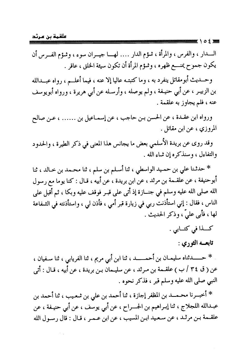 حَدَّثَنَا عَلِيُّ بْنُ حُمَيْدٍ الْوَاسِطِيُّ، ثَنَا أَسْلَمُ بْنُ سَلْمٍ، ثَنَا مُحَمَّدُ بْنُ خَالِدٍ، ثَنَا أَبُو حَنِيفَةَ، عَنْ عَلْقَمَةَ بْنِ مَرْثَدٍ، عَنِ ابْنِ بُرَيْدَةَ، عَنْ أَبِيهِ، قَالَ: كُنَّا يَوْمًا مَعَ رَسُولِ اللَّهِ صَلَّى اللهُ عَلَيْهِ وَسَلَّمَ فِي جِنَازَةٍ إِذْ أَتَى عَلَى قَبْرٍ، فَوَقَفَ عَلَيْهِ وَبَكَى، ثُمَّ أَقْبَلَ عَلَى النَّاسِ، فَقَالَ: " §إِنِّي اسْتَأْذَنْتُ رَبِّي فِي زِيَارَةِ قَبْرِ أُمِّي فَأَذِنَ لِي، وَاسْتَأْذَنْتُهُ فِي الشَّفَاعَةِ لَهَا فَأَبَى عَلَيَّ وَذَكَرَ الْحَدِيثَ، كَذَا فِي كِتَابِي. تَابَعَهُ الثَّوْرِيُّ: حَدَّثَنَاهُ سُلَيْمَانُ بْنُ أَحْمَدَ، ثَنَا ابْنُ أَبِي مَرْيَمَ، ثَنَا الْفِرْيَابِيُّ، ثَنَا سُفْيَانُ، عَنْ عَلْقَمَةَ بْنِ مَرْثَدٍ، عَنْ سُلَيْمَانَ بْنِ بُرَيْدَةَ، عَنْ أَبِيهِ، قَالَ: أَتَى النَّبِيُّ صَلَّى اللهُ عَلَيْهِ وَسَلَّمَ قَبْرَ، فَذَكَرَ نَحْوَهُ