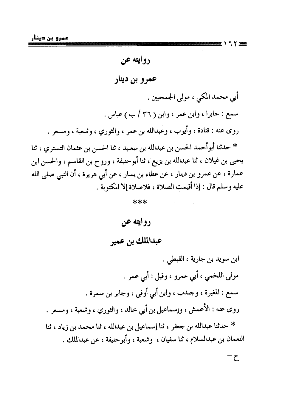 §رِوَايَتُهُ، عَنْ عَمْرِو بْنِ دِينَارٍ أَبِي مُحَمَّدٍ الْمَكِّيِّ، مَوْلَى الْجُمَحِيِّينَ سَمِعَ جَابِرًا، وَابْنَ عُمَرَ، وَابْنَ عَبَّاسٍ، رَوَى عَنْهُ: قَتَادَةُ، وَأَيُّوبُ، وَعَبْدُ اللَّهِ بْنُ عُمَرَ، وَالثَّوْرِيُّ، وَشُعْبَةُ، وَمِسْعَرٌ