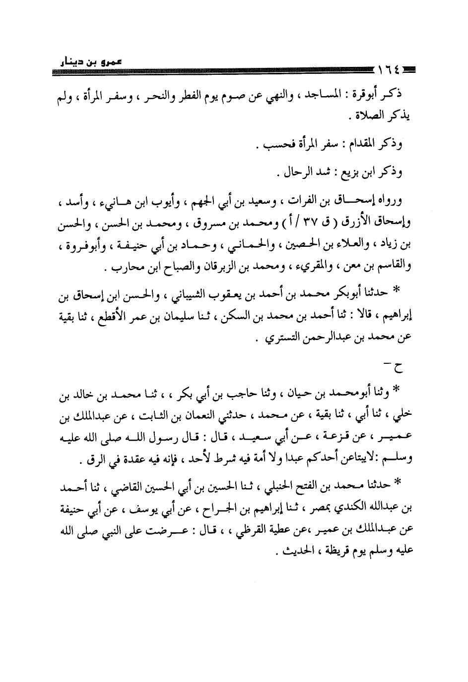 حَدَّثَنَا أَبُو بَكْرٍ مُحَمَّدُ بْنُ أَحْمَدَ بْنِ يَعْقُوبَ الشَّيْبَانِيُّ، وَالْحَسَنُ بْنُ إِسْحَاقَ بْنِ إِبْرَاهِيمَ قَالَا: ثَنَا أَحْمَدُ بْنُ مُحَمَّدِ بْنِ السَّكَنِ، ثَنَا سُلَيْمَانُ بْنُ عُمَرَ الْأَقْطَعُ، ثَنَا بَقِيَّةُ، عَنْ مُحَمَّدِ بْنِ عَبْدِ الرَّحْمَنِ التُّسْتَرِيِّ، ح وَثنا أَبُو مُحَمَّدِ بْنُ حَيَّانَ، وَثنا حَاجِبُ بْنُ أَبِي بَكْرٍ، ثَنَا مُحَمَّدُ بْنُ خَالِدِ بْنِ خَلِيٍّ، ثَنَا أَبِي، ثَنَا بَقِيَّةُ، عَنْ مُحَمَّدٍ، حَدَّثَنِي النُّعْمَانُ بْنُ الثَّابِتِ، عَنْ عَبْدِ الْمَلِكِ بْنُ عُمَيْرٍ، عَنْ قَزَعَةَ، عَنْ أَبِي سَعِيدٍ، قَالَ: قَالَ رَسُولُ اللَّهِ صَلَّى اللهُ عَلَيْهِ وَسَلَّمَ: «§لَا يَبْتَاعَنَّ أَحَدُكُمْ عَبْدًا، وَلَا أَمَةً فِيهِ شَرْطٌ لِأَحَدٍ، فَإِنَّهُ فِيهِ عُقْدَةٌ فِي الرِّقِّ» حَدَّثَنَا مُحَمَّدُ بْنُ الْفَتْحِ الْحَنْبَلِيُّ، ثَنَا الْحُسَيْنُ بْنُ أَبِي الْحُسَيْنِ الْقَاضِي، ثَنَا أَحْمَدُ بْنُ عَبْدِ اللَّهِ الْكِنْدِيُّ، بِمِصْرَ، ثَنَا إِبْرَاهِيمُ بْنُ الْجَرَّاحِ، عَنْ أَبِي يُوسُفَ، عَنْ أَبِي حَنِيفَةَ، عَنْ عَبْدِ الْمَلِكِ بْنِ عُمَيْرٍ، عَنْ عَطِيَّةَ الْقُرَظِيِّ، قَالَ: عُرِضَتْ عَلَى النَّبِيِّ صَلَّى اللهُ عَلَيْهِ وَسَلَّمَ يَوْمَ قُرَيْظَةَ، الْحَدِيثَ